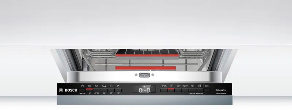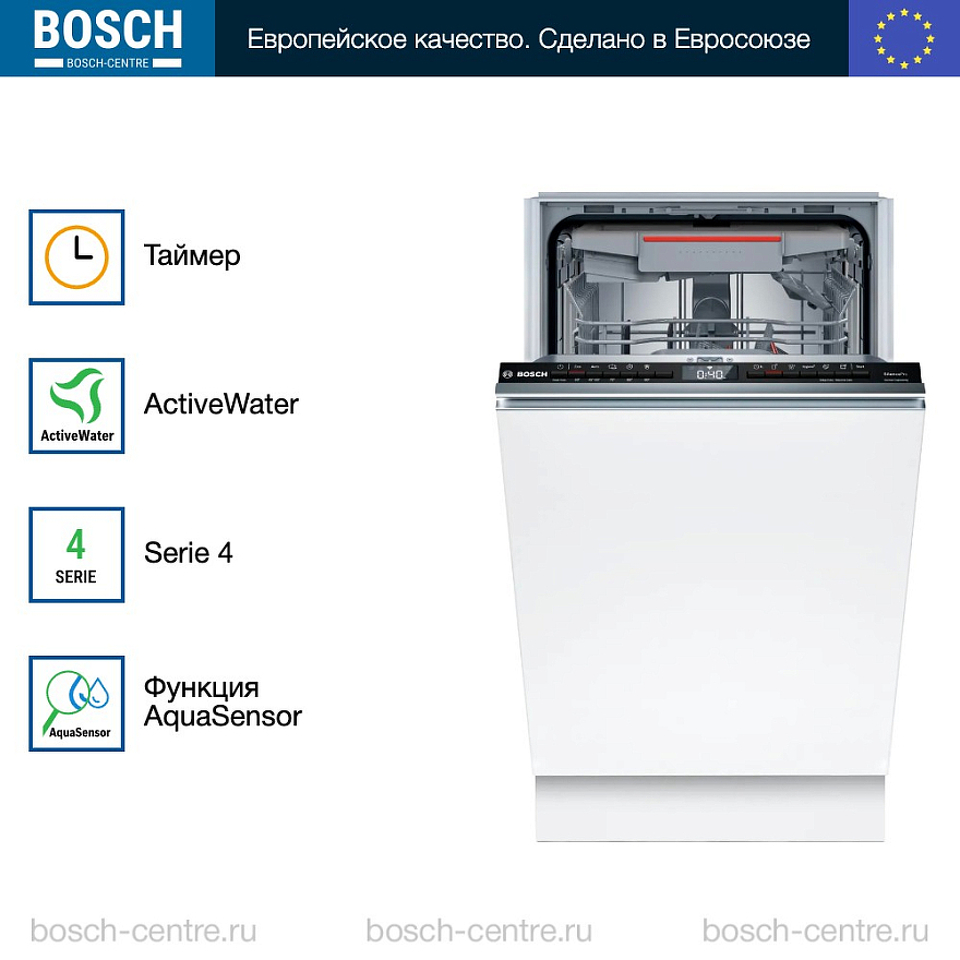 Встраиваемая посудомоечная машина Bosch SPV4HMX55Q представляет собой современное и функциональное решение для вашей кухни. Она идеально вписывается в любой интерьер благодаря своему узкому дизайну и элегантной черной панели управления. На панели расположены кнопки управления и информативный дисплей, который показывает наличие ополаскивателя, соли и время до окончания программы.
