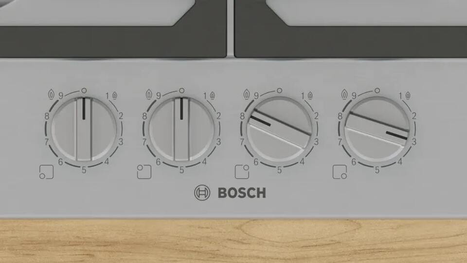 Газовая варочная панель Bosch PCP6A5I90M оснащена четырьмя конфорками разной мощности, оптимально распределённые для комфорта: передняя левая и задняя левая по 1.75 кВт, передняя правая 1 кВт, а задняя правая — форсированная с мощностью 3 кВт; суммарная отдача всех горелок достигает 7.5 кВт, что позволяет одновременно готовить несколько блюд без потери эффективности. Конструкция решёток выполнена из чугуна, они надёжно фиксируют посуду и выдерживают большие тепловые нагрузки, при этом удобны для перемещения и очищения. Поворотные элементы управления просты в использовании: интуитивно понятные ручки обеспечивают плавную регулировку, девять ступеней мощности дают точный контроль над интенсивностью пламени и соответствуют самым разным рецептам — от томления до быстрого кипячения.