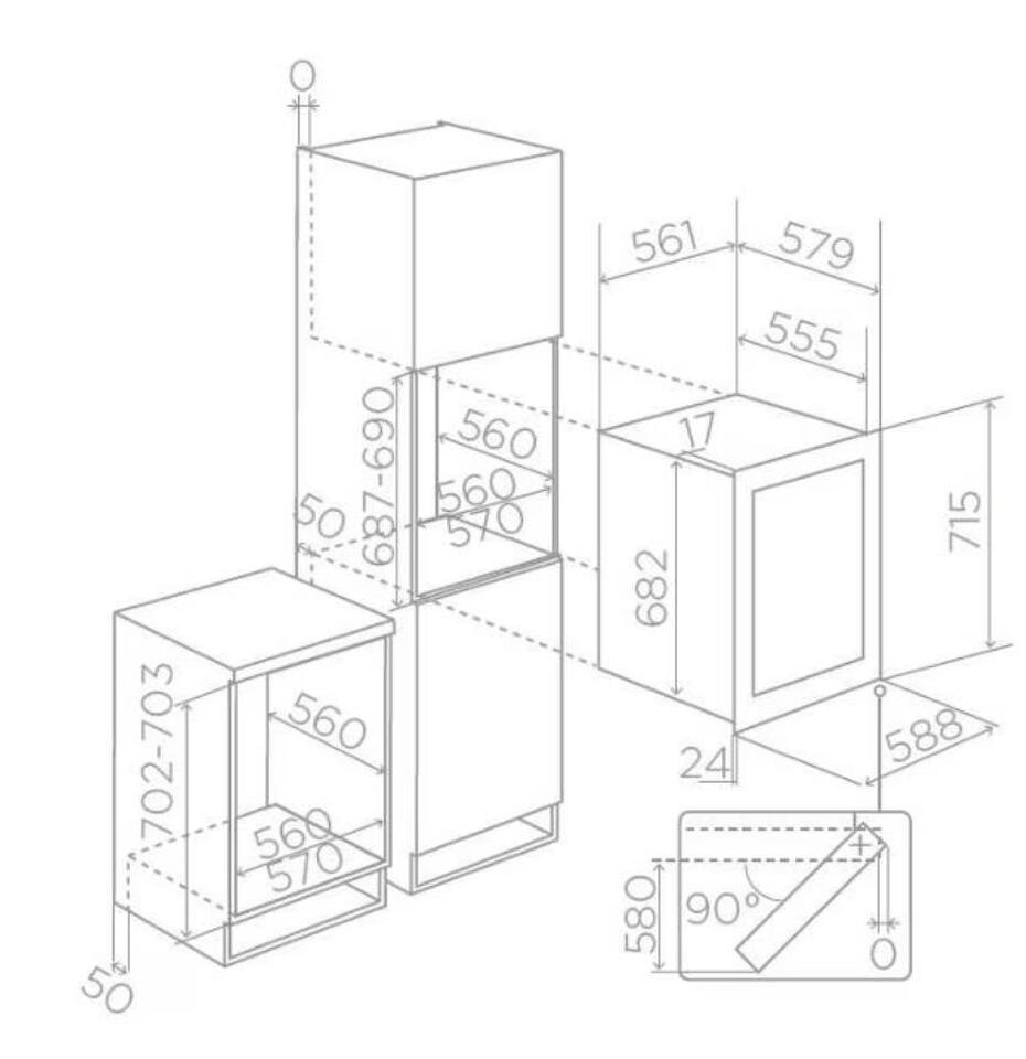 Устройство оборудовано стеклянной дверью, которая позволяет максимально рассмотреть содержимое, не открывая камеру. Внутри установлены LED-лампы. Управление обеспечивает кнопочная панель, индикаторы показывают выбранный режим. Габариты шкафа — 71,5х58,8х57,9 см, вес — 41 кг. Для монтажа используется ниша размером 68,7х56х56 см.