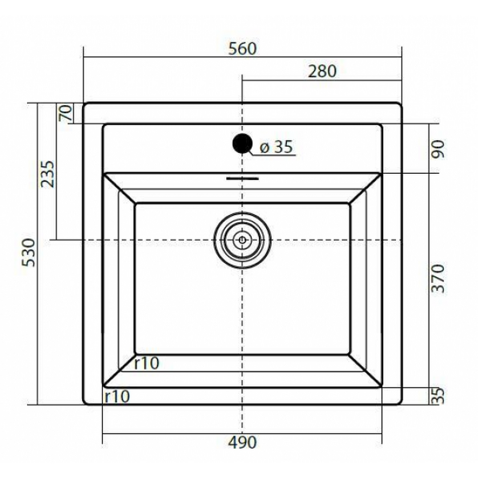 Мойка из Тектонита, прямоугольная, 1 отверстие под смеситель, выпуск 3 1/2", скрытый перелив под металической пластиной, мойка 560 x 530 мм, чаша 504 x376 x 200 мм, глубина 20 см.