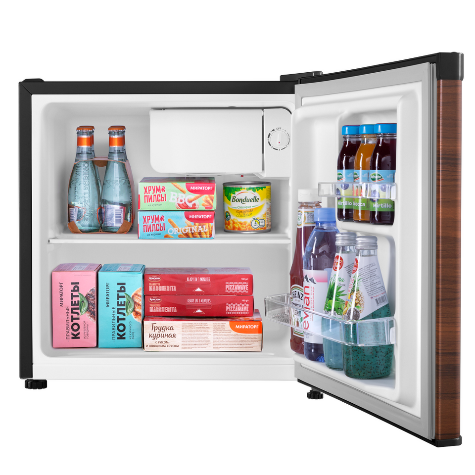 Компактный однокамерный однодверный холодильник высотой всего 50 см с камерой охлаждения, располагающейся в верхнем углу.