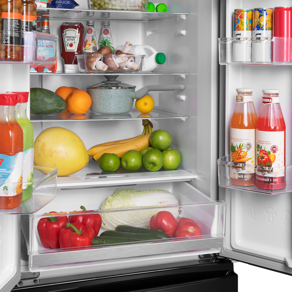 Полки из закалённого ударопрочного стекла позволяют хранить крупные и габаритные продукты и тяжёлую посуду. Полки оснащены стильными металлическими фреймами. И это не только декоративный элемент, придающий холодильнику современный вид: фреймы защищают от трещин и сколов, а также препятствуют стеканию жидкостей в случае их пролития.