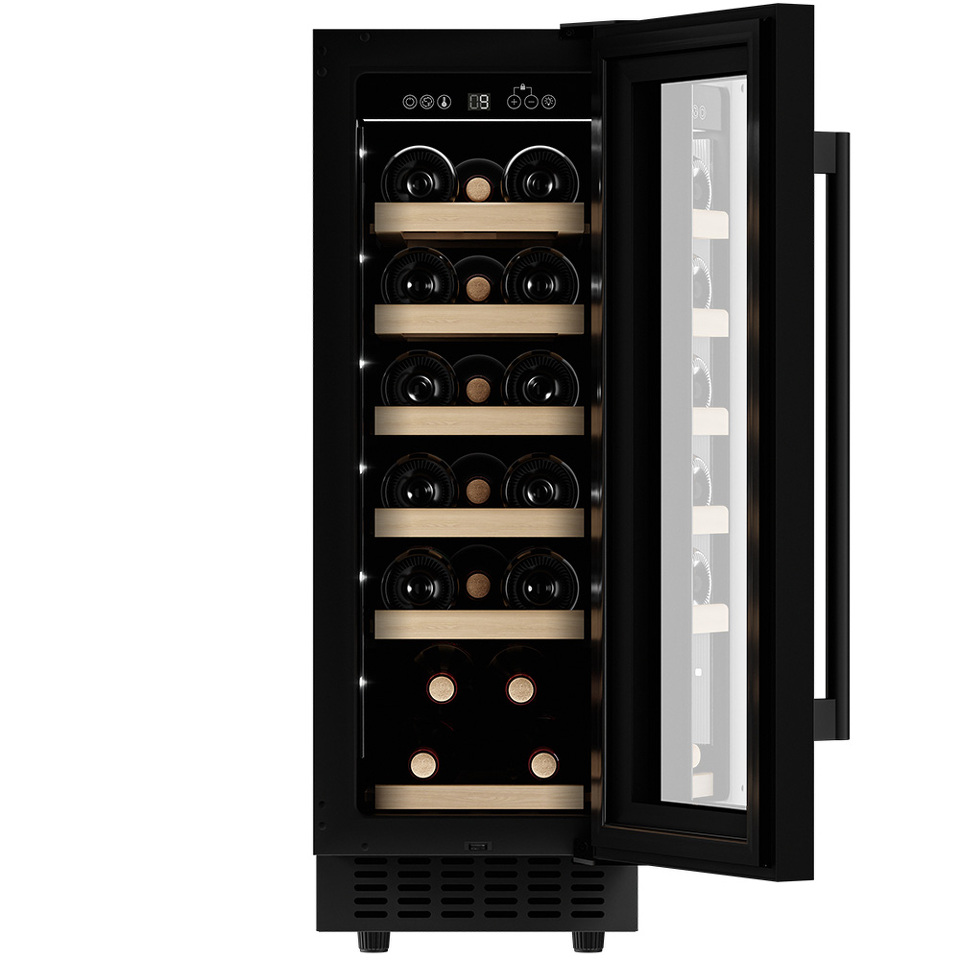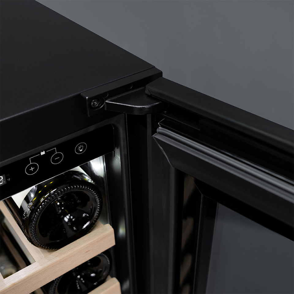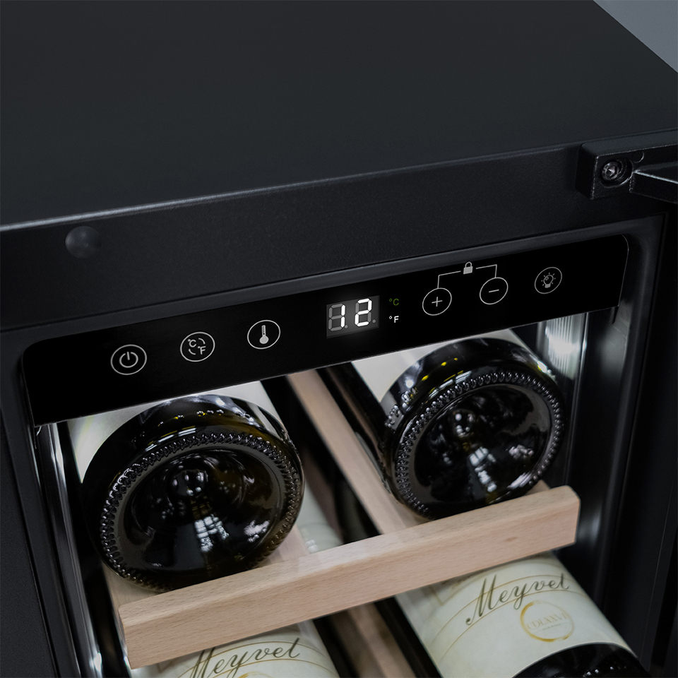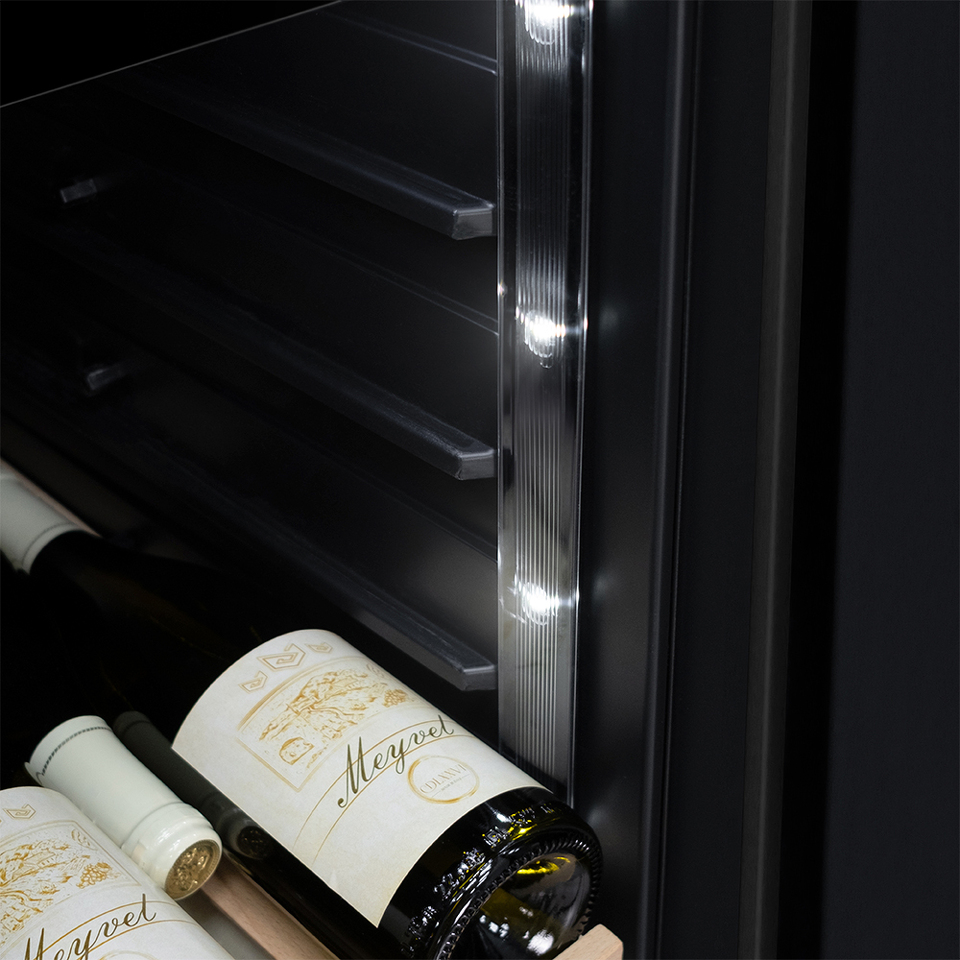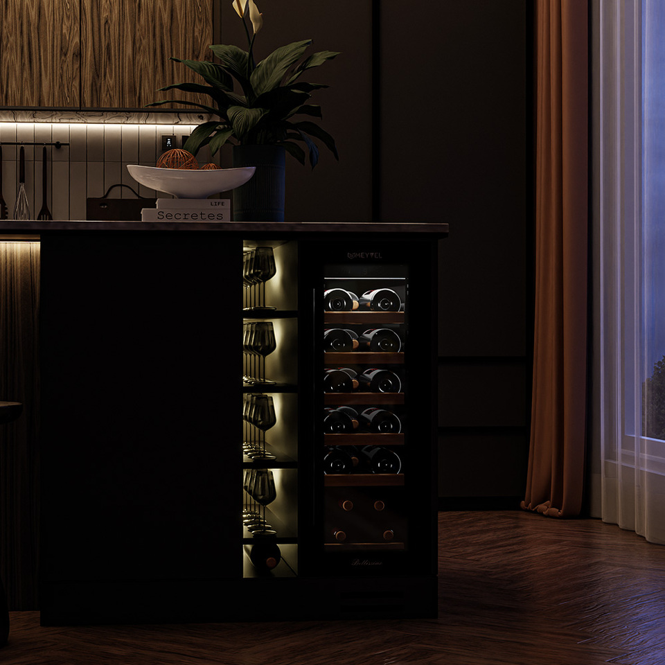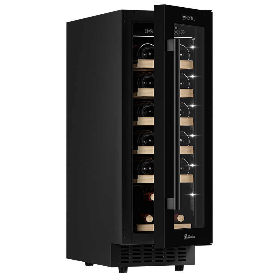 Компрессорный винный шкаф Meyvel MV19-KBT1 обладает оптимальной вместимостью и даёт возможность разместить до 19 бутылок стандартного типа Бордо (0,75 л). Располагаются они на выдвижных полках из дерева. Внутреннее пространство шкафа поддерживает комфортную для вина температуру от +5°C до +20°C. Так же, эта модель поддерживает влажность в диапазоне 60-80%, как в настоящем винном погребе.