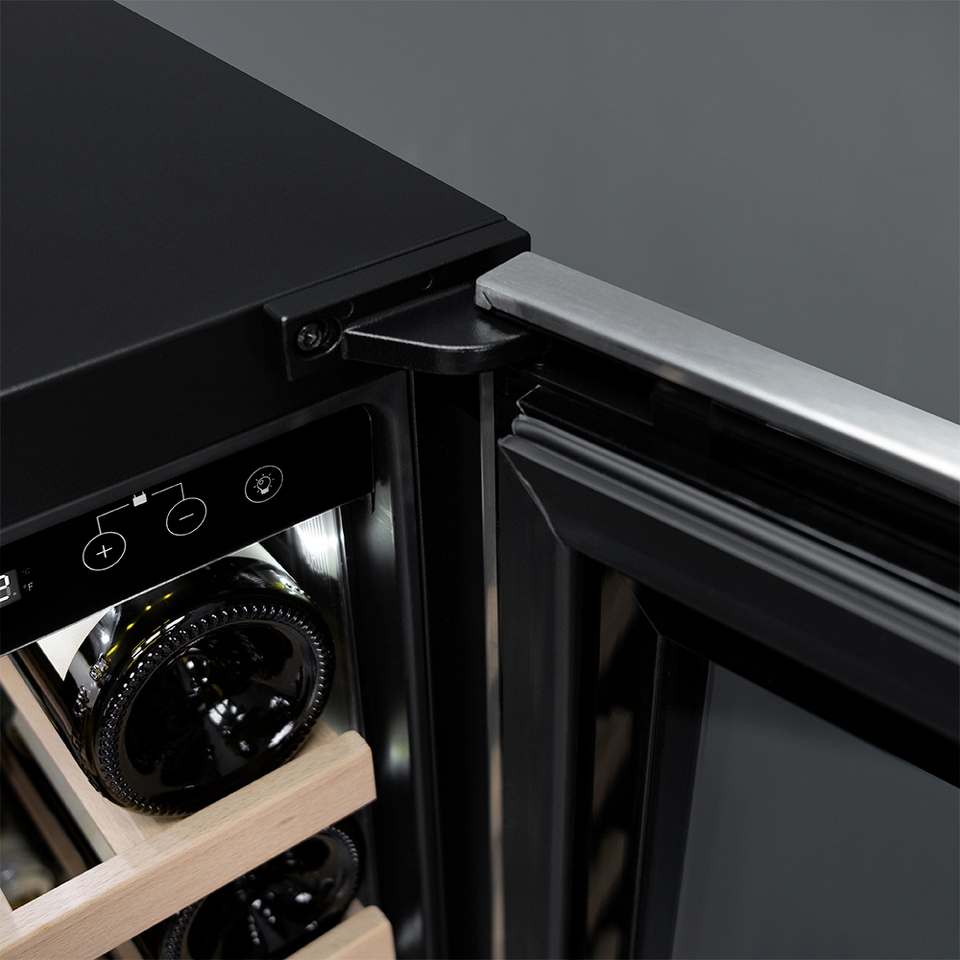 необходимо установить винный шкаф по уровню и отрегулировать зазоры между дверью и мебельным фасадом, чтобы не повредить их.
