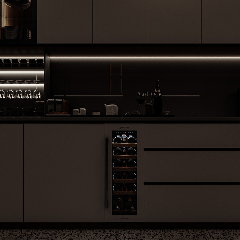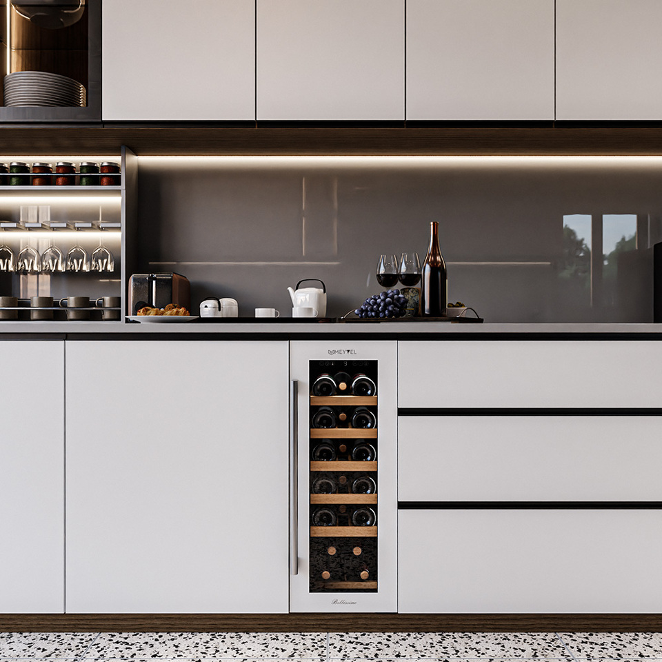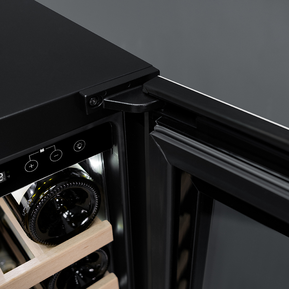 необходимо установить винный шкаф по уровню и отрегулировать зазоры между дверью и мебельным фасадом, чтобы не повредить их.