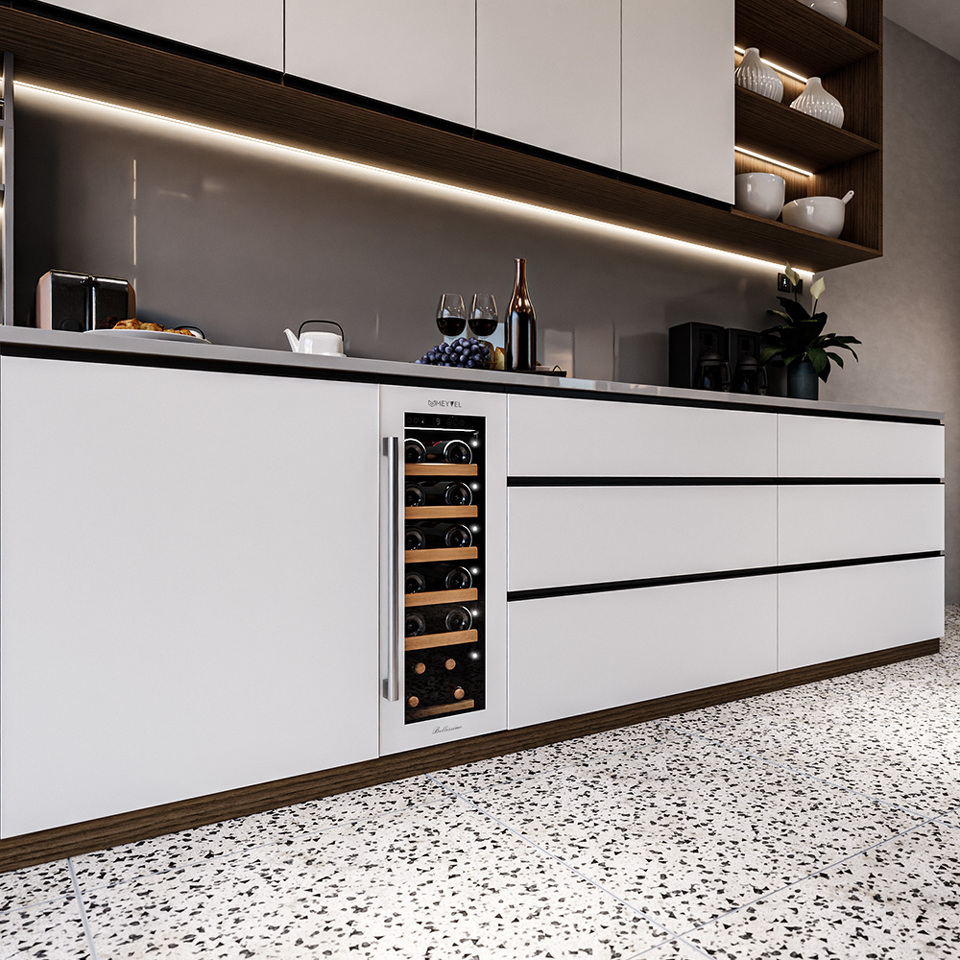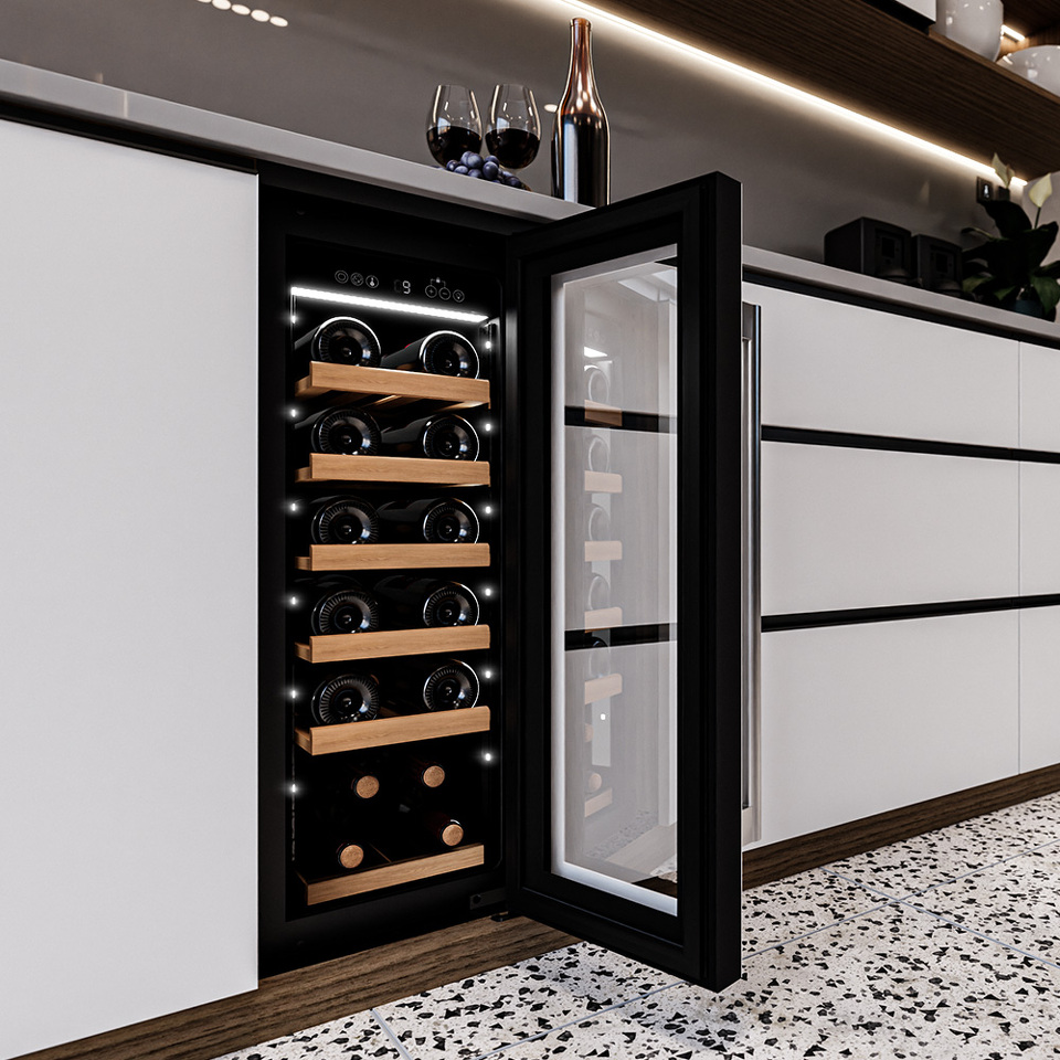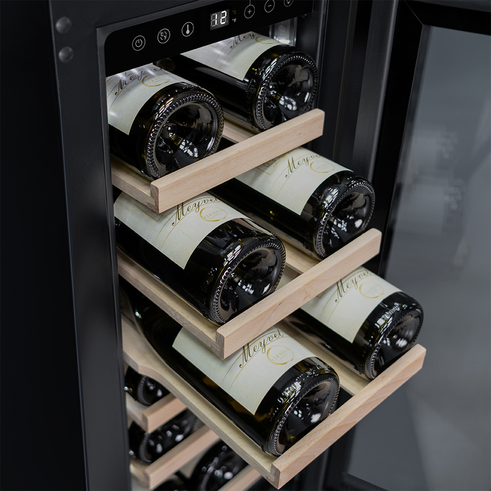 Компрессорный винный шкаф Meyvel MV19-KWT1 обладает оптимальной вместимостью и даёт возможность разместить до 19 бутылок стандартного типа Бордо (0,75 л). Располагаются они на выдвижных полках из дерева. Внутреннее пространство шкафа поддерживает комфортную для вина температуру от +5°C до +20°C. Так же, эта модель поддерживает влажность в диапазоне 60-80%, как в настоящем винном погребе.