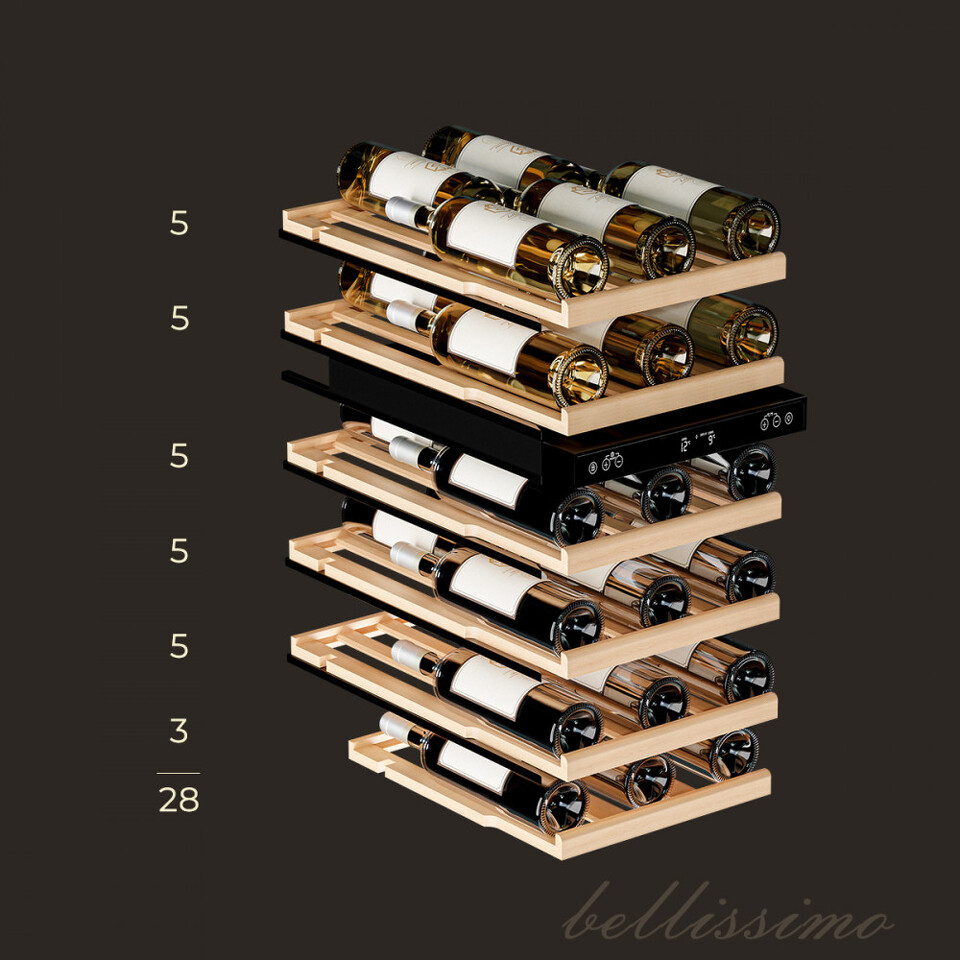 Вместимость 28 бутылок стандартного типа Бордо (0,75 л);