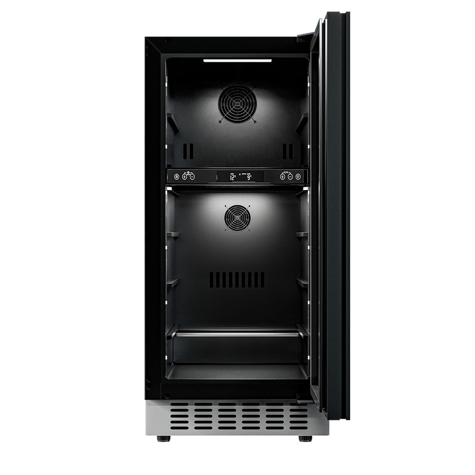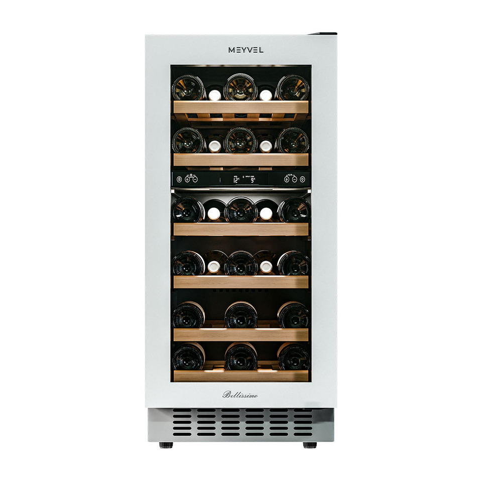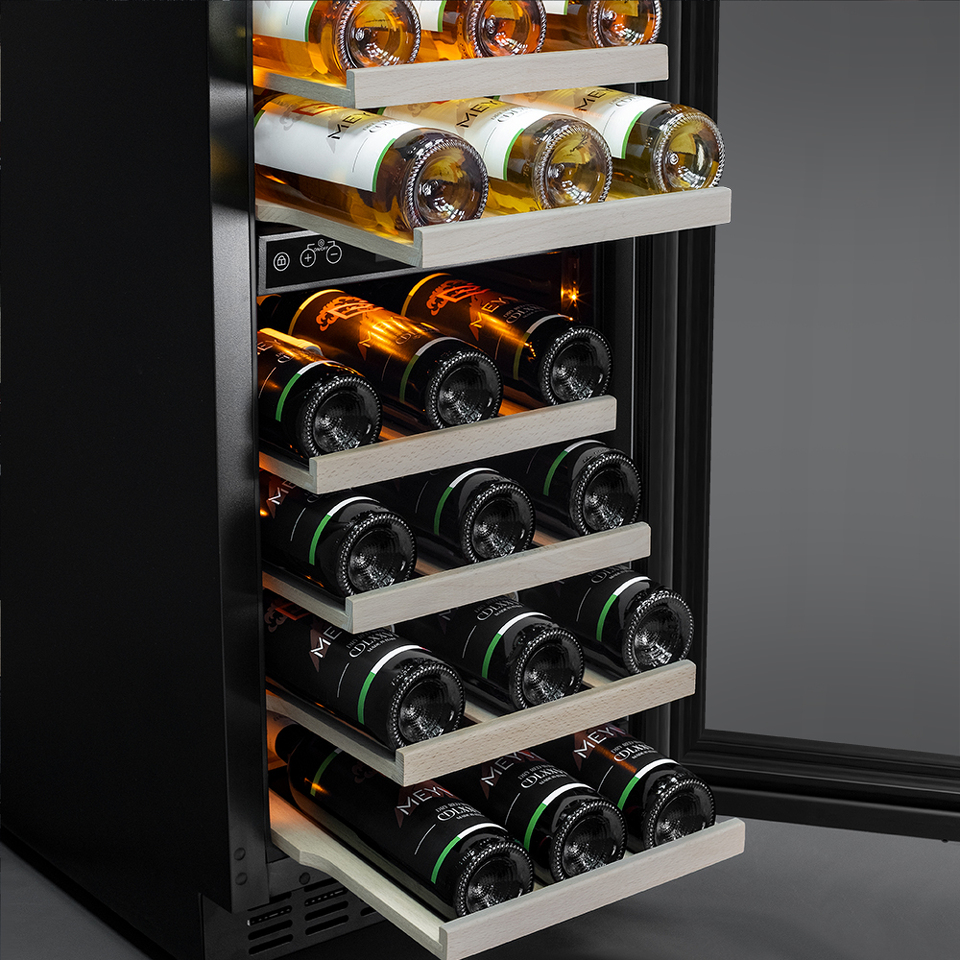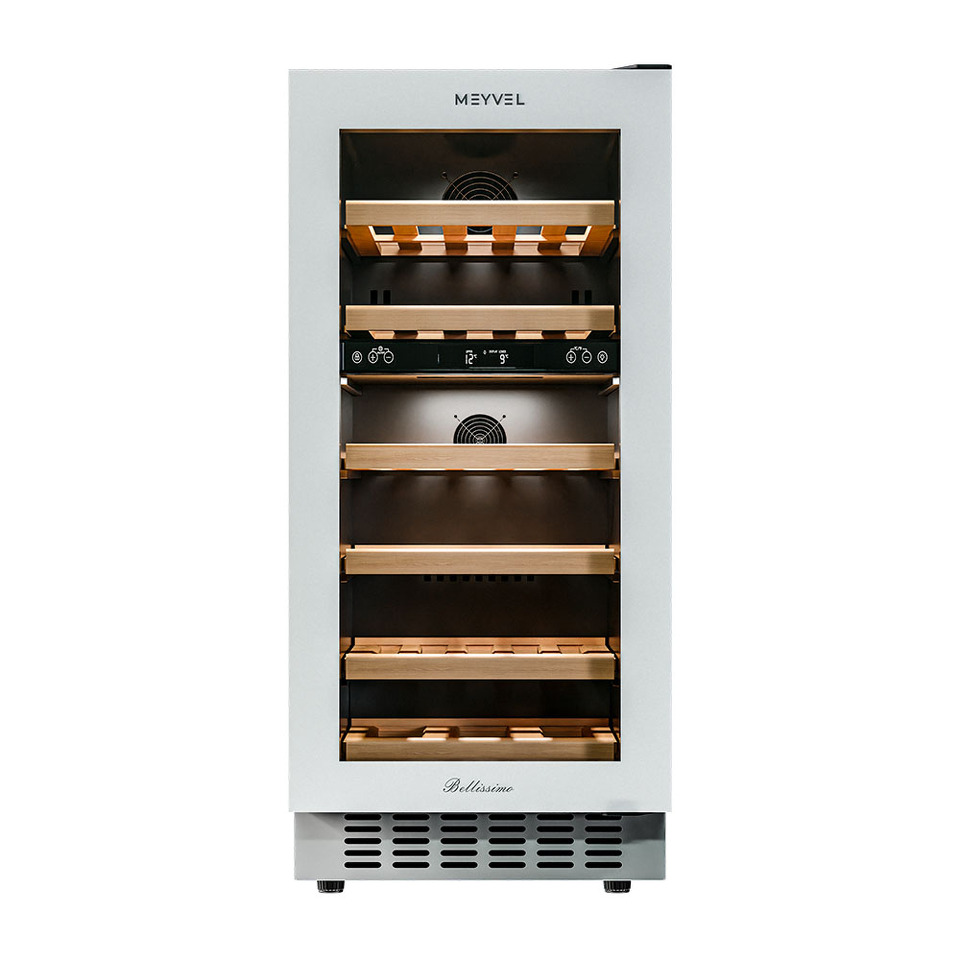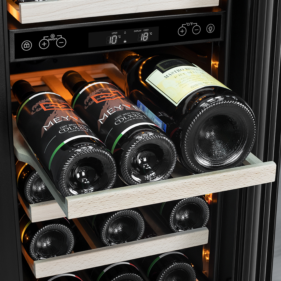Компрессорный винный шкаф Meyvel MV28NH-KWT2 обладает большой вместимостью и даёт возможность разместить до 28 бутылок стандартного типа Бордо (0,75 л). Располагаются они на выдвижных полках из дерева. Внутреннее пространство шкафа разделено на 2 температурные зоны, с возможностью настраиваить каждую из них. Общий диапазон температуры у данной модели от +5°C до +20°C.