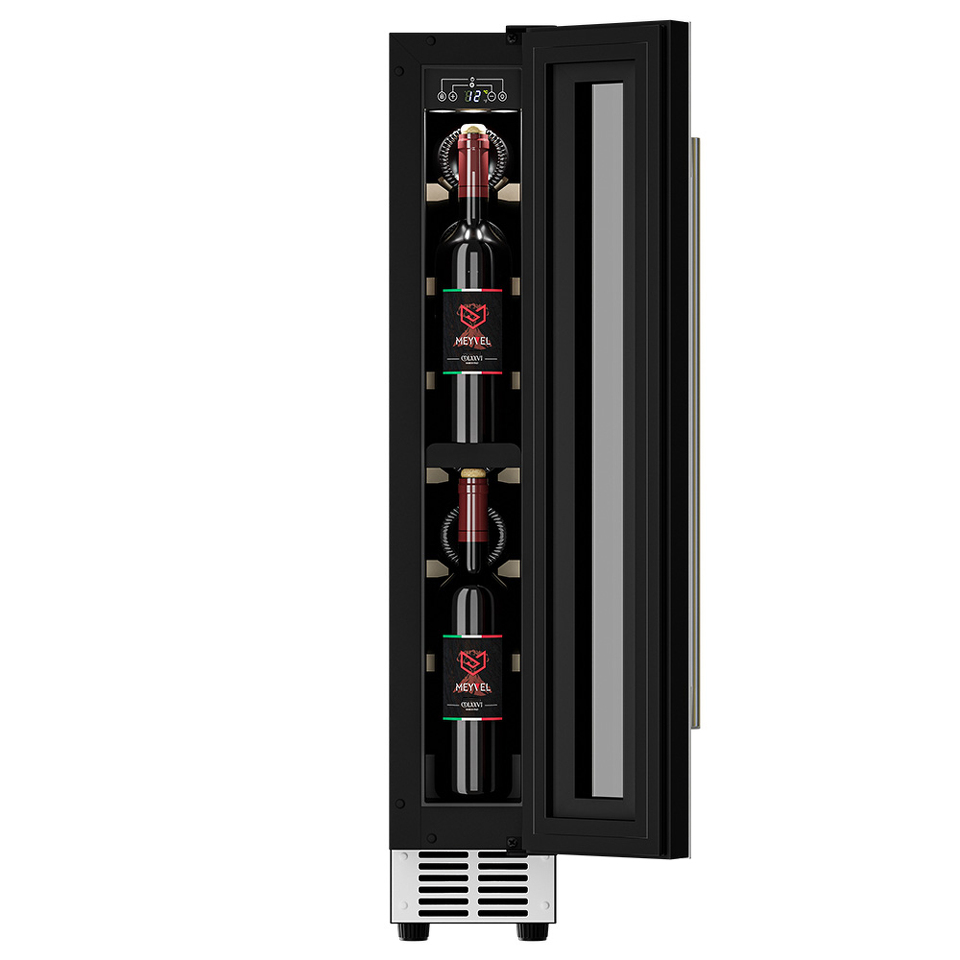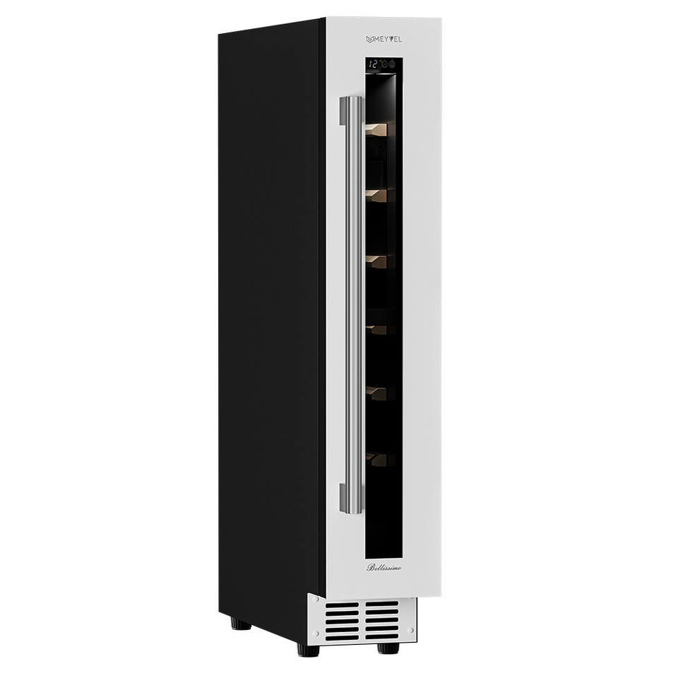 Компрессорный винный шкаф Meyvel MV9-KWT1 несмотря на небольшой размер, обладает большой вместимостью и дает возможность разместить до 9 бутылок. Располагаются они на держателях из массива бука. Внутреннее пространство шкафа поддерживает комфортную для вина температуру от +5℃ до +20℃ и имеет самую большую вместимость среди аналогичных винных шкафов. Преимуществом этой модели является возможность разместить внутри одну высокую бутылку. Так же, MV9-KWT1 данная модель поддерживает влажность в диапазоне 60-80%, как в настоящем винном погребе.