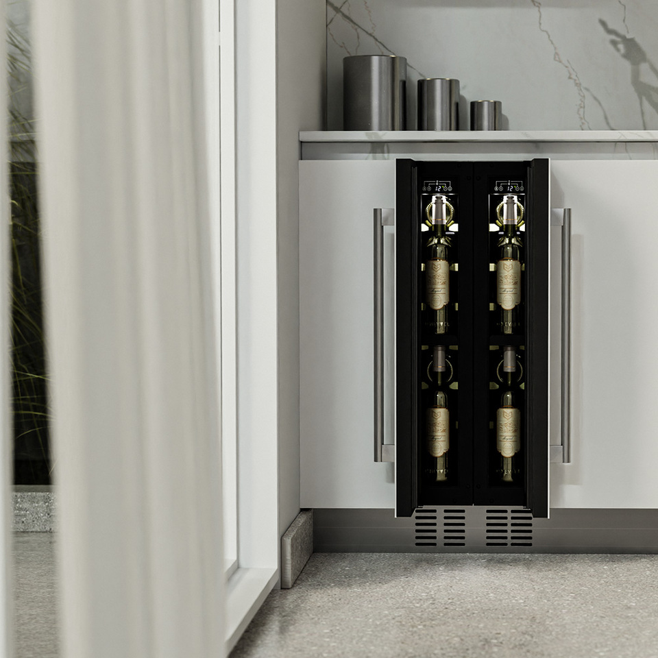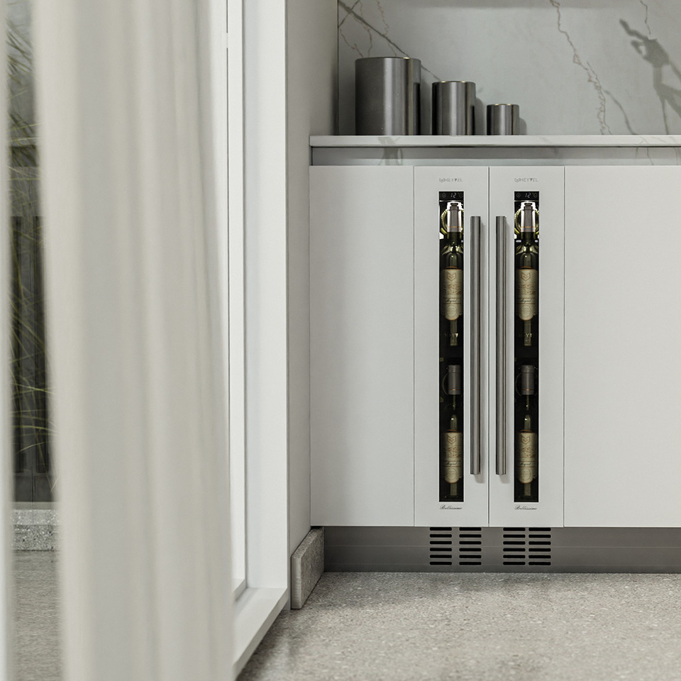 необходимо установить винный шкаф по уровню и отрегулировать зазоры между дверью и мебельным фасадом, чтобы не повредить их.