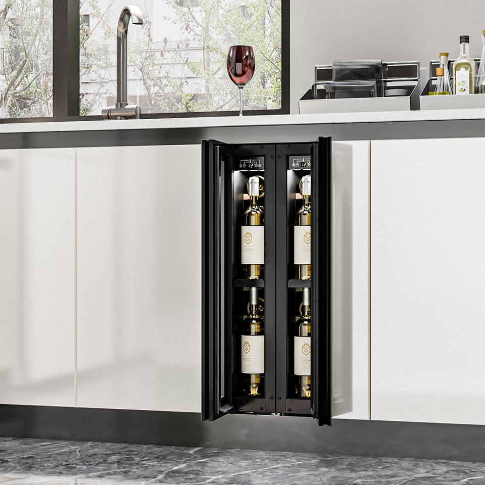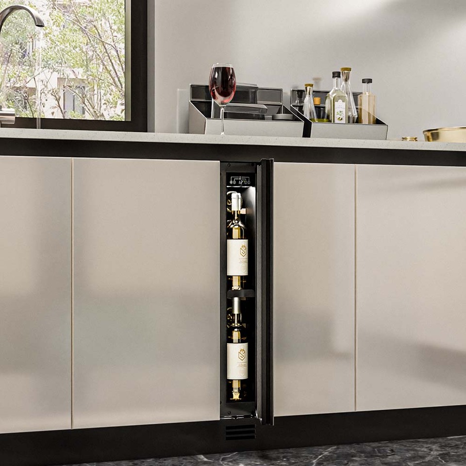 необходимо установить винный шкаф по уровню и отрегулировать зазоры между дверью и мебельным фасадом, чтобы не повредить их.