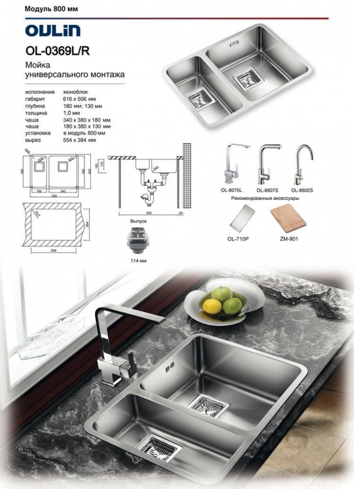 OULIN OL-0369L добротная мойка универсально монтажа. Мойки OULIN производятся из высококачественной нержавеющей стали марки 304. Поверхность мойки – сатиновая (Satin). Толщина стали - 1 мм. Шумопоглощающие накладки с обратной стороны мойки.Возможен вариант расположения чаши слева и справа.