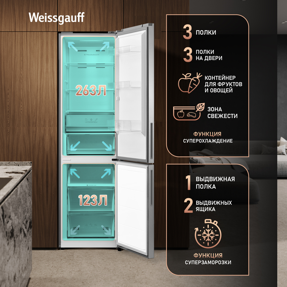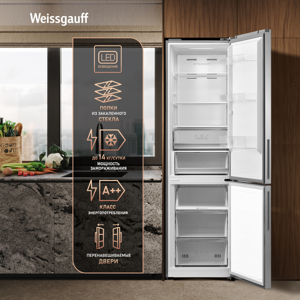 Холодильник с нижней морозилкой Weissgauff WRK 2010 DX Inverter Total NoFrost