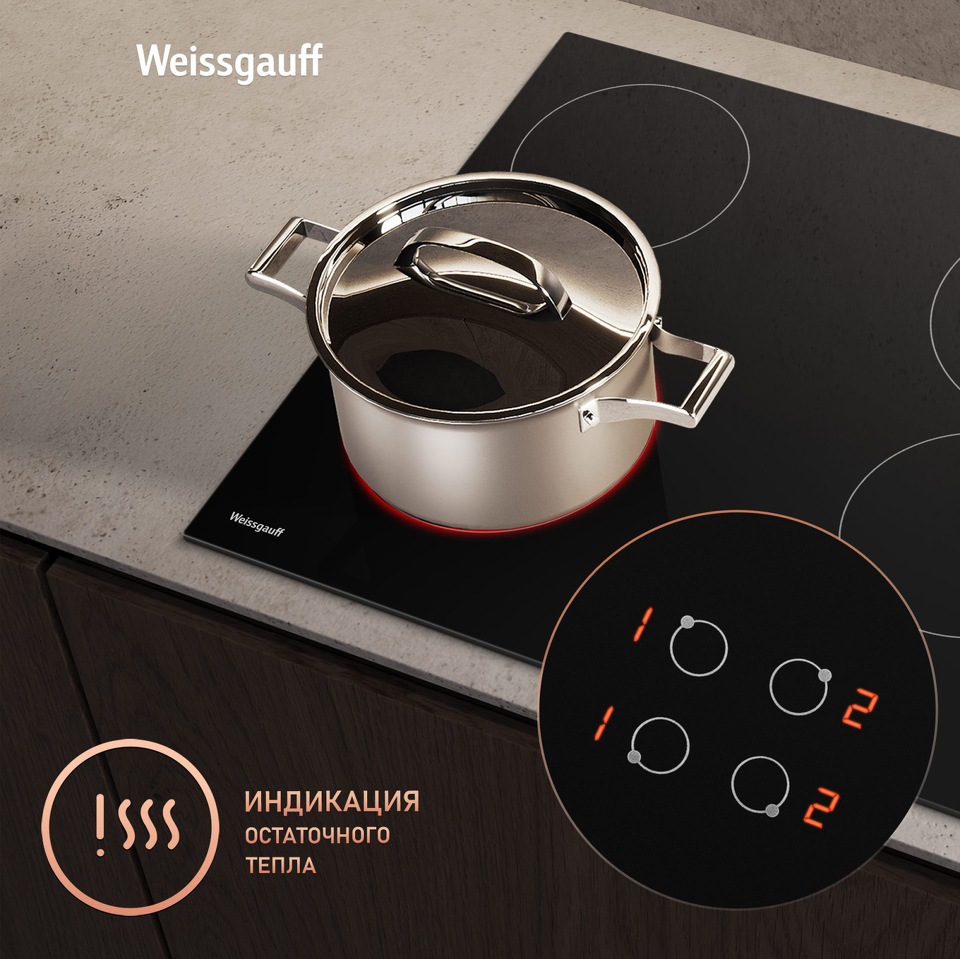 Индикация остаточного тепла, сообщающая вам о том, когда прикасаться к конфорке уже безопасно, а когда - еще нет, ведь в течение некоторого времени после выключения, поверхность варочной панели все еще может оставаться горячей.