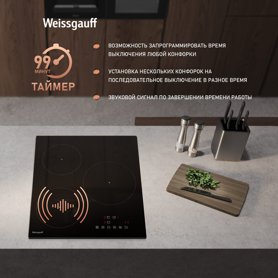 Таймер до 99 минут дает вам возможность запрограммировать время выключения любой конфорки, с точностью до минуты