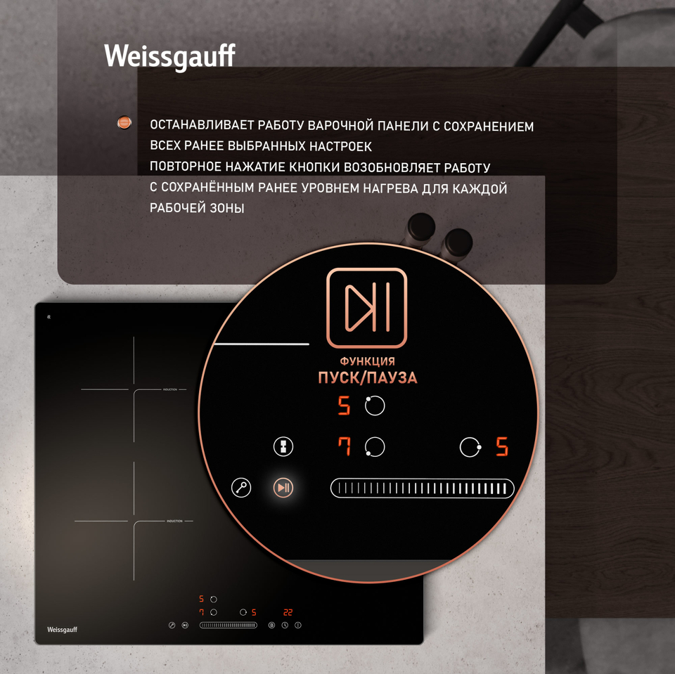 Функция Пуск/ Пауза будет особенно удобна, если вас отвлек телефонный звонок или другие дела: всего лишь нажмите на эту кнопку, чтобы поставить работу варочной панели на паузу, а затем нажмите еще раз, чтобы продолжить нагрев со всеми выбранными настройками, и варочная панель вернется к заданной мощности!