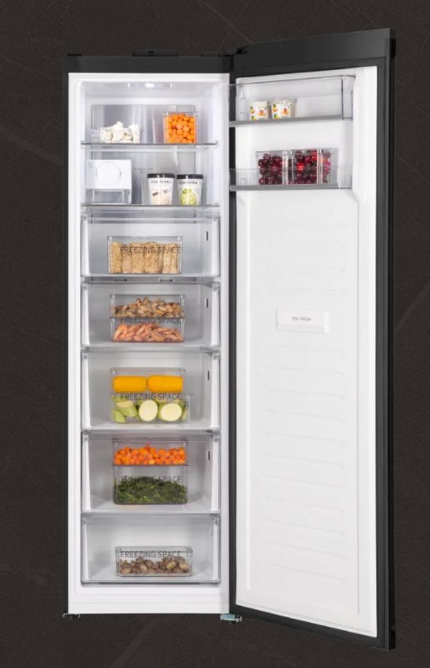 Дверь вертикального морозильника имеет уникальный дизайн, выполнена из закаленного стекла черного цвета. Дверь можно перенавесить с правой стороны на левую. Для легкого открывания в модели предусмотрена функция автооткрытия стуком — необходимо постучать по верхней части поверхности более двух раз, и дверь морозильника приоткроется.