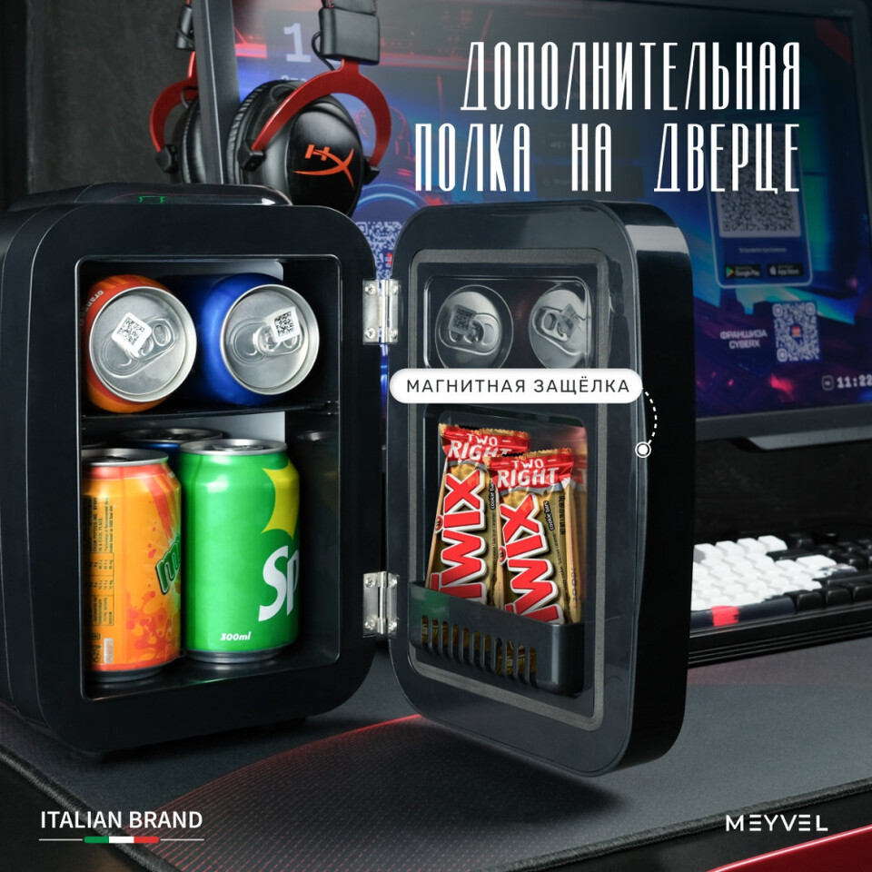 Meyvel MD-04C3B-RGB — компактный, стильный и по-настоящему универсальнй холодильник для напитков, который пригодится дома, в офисе или гостиничном номере. Благодаря небольшим габаритам его легко поставить на стол, тумбу или ресепшен, а при необходимости без труда переставить в другое место.