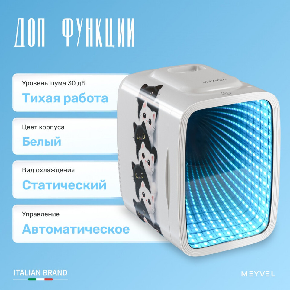 Отдельное внимание привлекает RGB-подсветка. Пользователь может выбрать один из шести оттенков: красный, синий, зелёный, салатовый, фиолетовый или голубой. Она создаёт особую атмосферу в помещении, подчёркивает современность устройства.В целом, Meyvel MD-04C3W-RGB — это функциональный интерьерный акцент. Он одинаково уместен в рабочем кабинете, гостиничном номере, салоне красоты или дома, где важны комфорт, мобильность и аккуратное хранение.