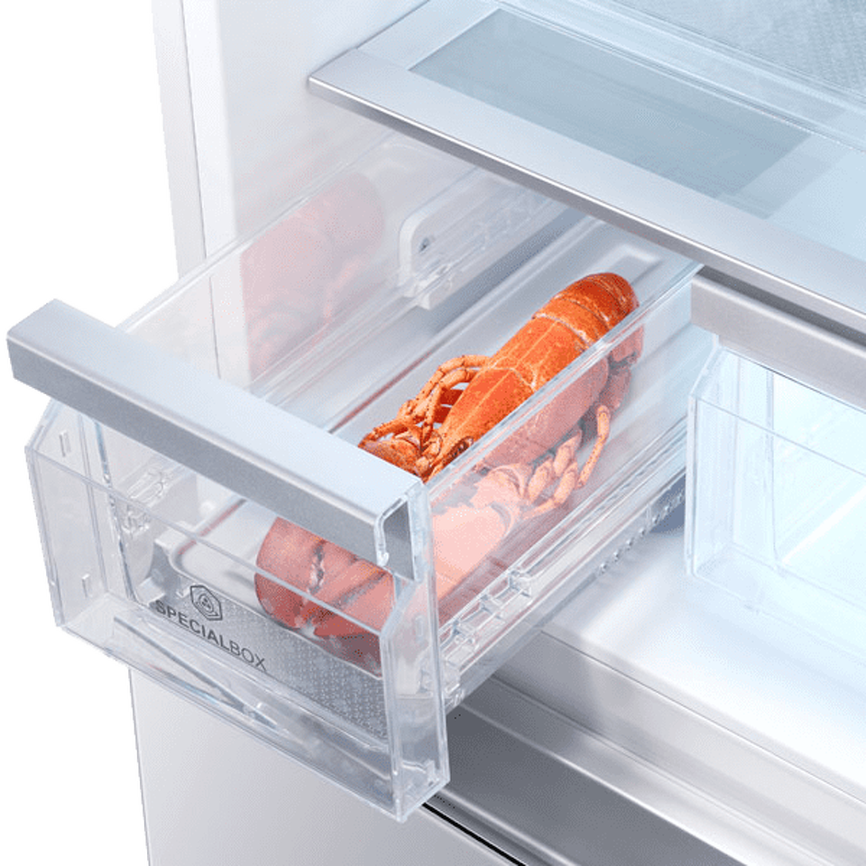 Трехдверный холодильник с независимыми контейнерами морозилки и технологией Total No Frost: нет наледи в отделениях и на продуктах, нет необходимости в ручном размораживании. Сухой и холодный воздуха из морозилки не попадает в холодильное отделение, а из него в морозилку не уходят запахи продуктов — благодаря двухконтурному охлаждению. Все продукты хорошо видны — это обеспечивает встроенная в заднюю стенку холодильного отделения светодиодная колонна Tower LED. В зоне Instant Cool можно быстро охлаждать напитки, а ультрафиолетовое излучение Fresh Turbo служит антибактериальной обработке: в холодильнике не развиваются бактерии, нет неприятных запахов, продукты дольше хранятся.