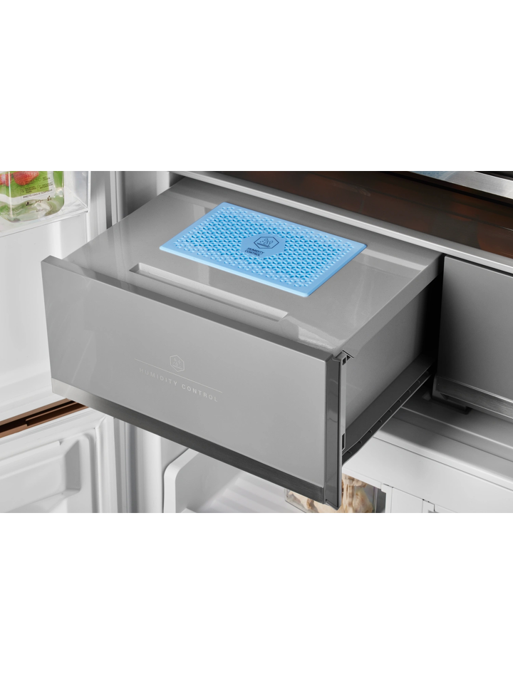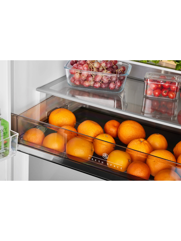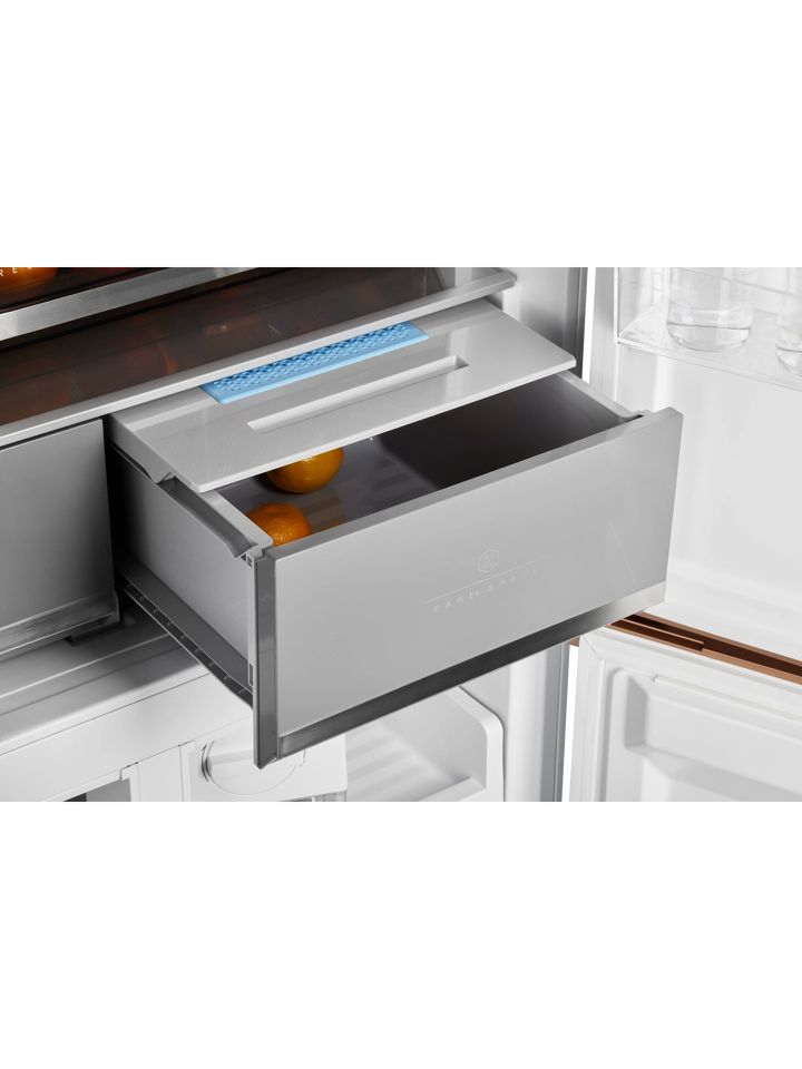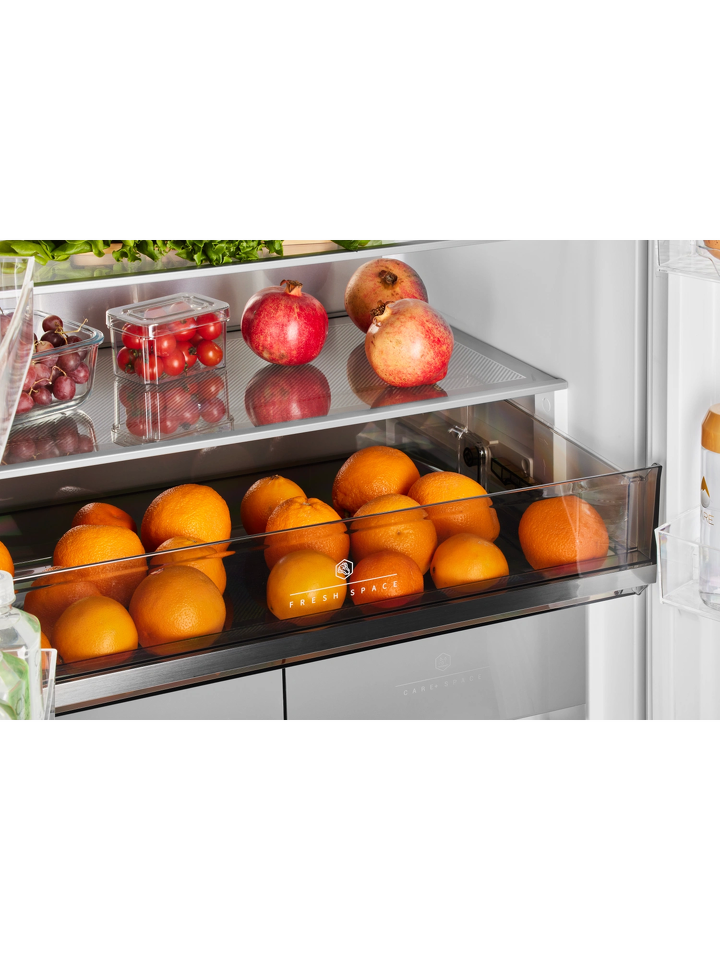 Ящик CARE+SPACE с индивидуальной зоной охлаждения предназначен для хранения продуктов в нескольких режимах: «морепродукты» при температуре -1,5°С, «мясо» с показателем 2°С и «детское питание, фрукты» с температурой 4°С. Установленная в ящике мембрана поддерживает нужный для каждого из режимов уровень влажности. Выдвижное отделение для овощей и фруктов также оборудовано мембраной для удержания влаги внутри зоны, при этом не препятствует движению воздуха. Выдвижные крышки обоих ящиков обеспечивают дополнительную герметичность емкостей.
