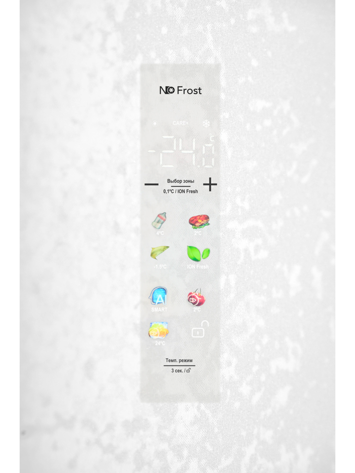 Режим SMART сохраняет свежесть продуктов, используя оптимальные показатели для эффективного энергопотребления: 5°С – в холодильном отделении, -18°С – в морозильной камере и 4°С – в зоне с настраиваемой температурой CARE+SPACE.
