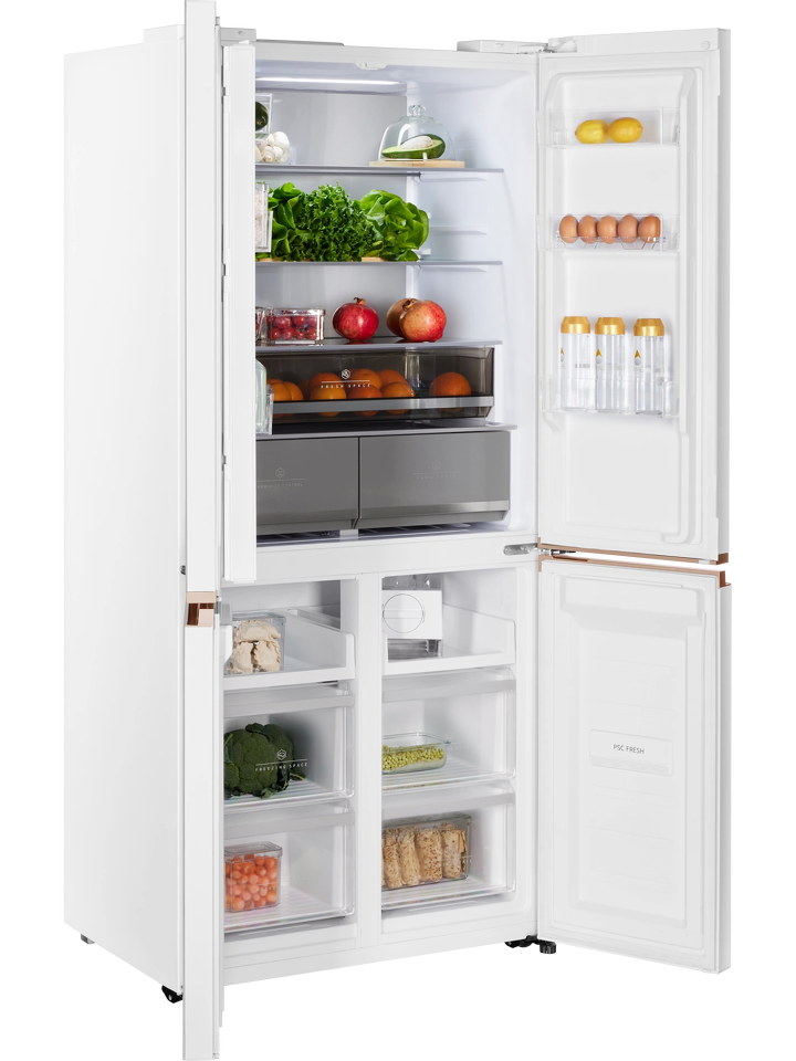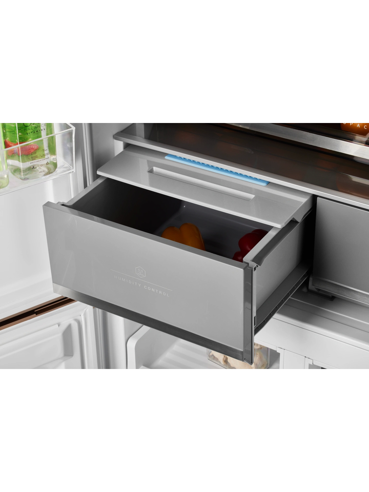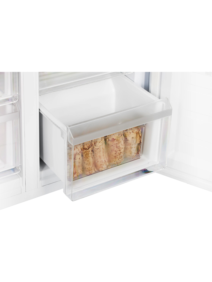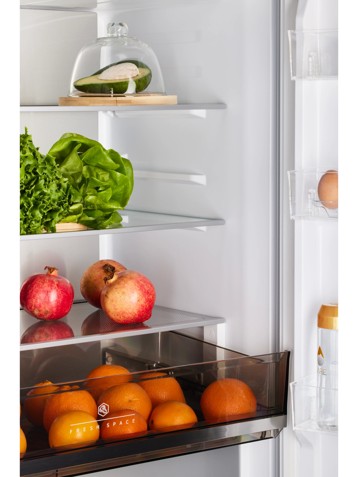 Усовершенствованная конструкция отдельно стоящей модели и глубина 60 см позволят при необходимости гармонично интегрировать холодильник в мебельный гарнитур: достаточно всего 3 мм свободного пространства по бокам. А угол открытия двери в 90 градусов не препятствует полному выдвижению ящиков.