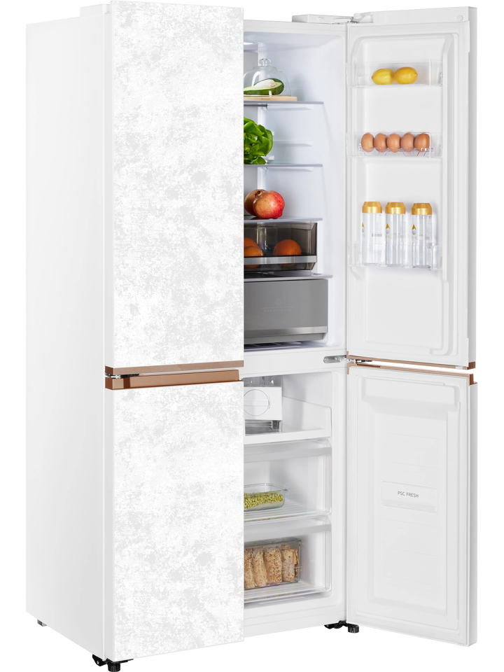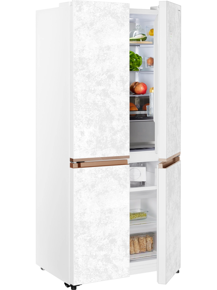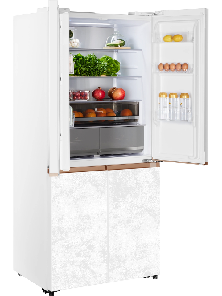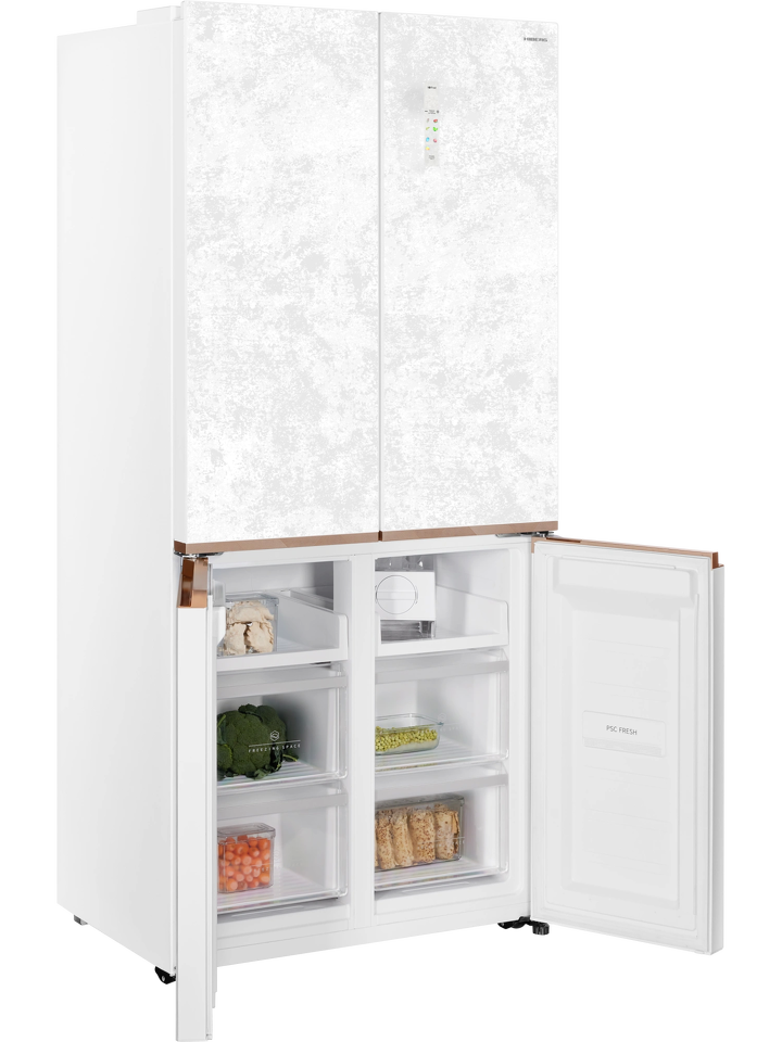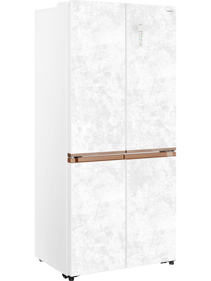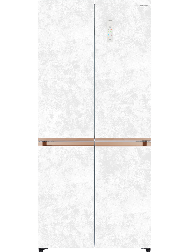 Четырехдверный инверторный холодильник HIBERG i-RFQ 630G WS – изысканный представитель бренда. Эффектный фасад из закаленного стекла в белом цвете с эффектом мрамора станет украшением любого кухонного и столового интерьера.