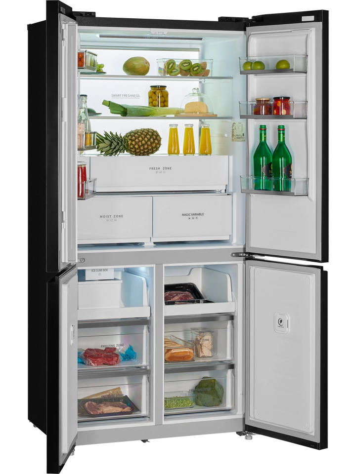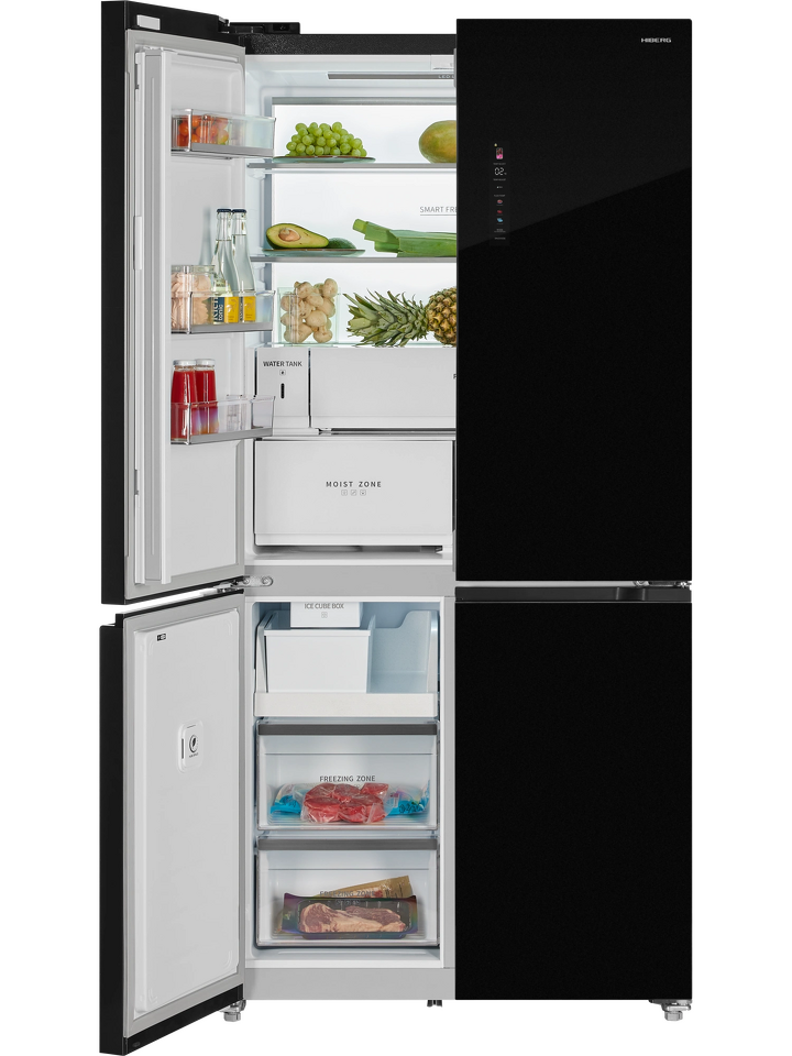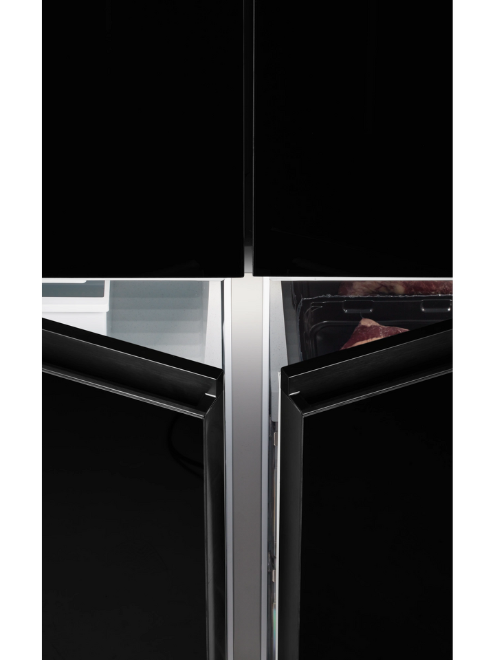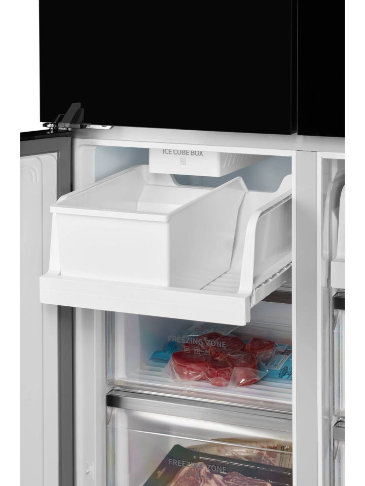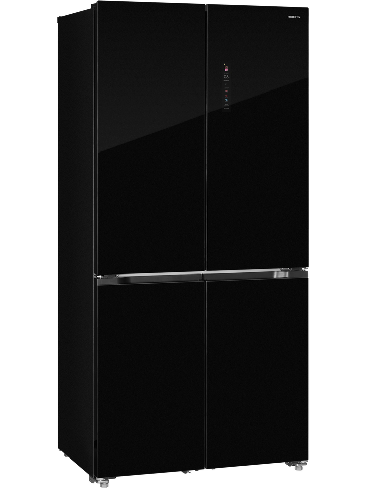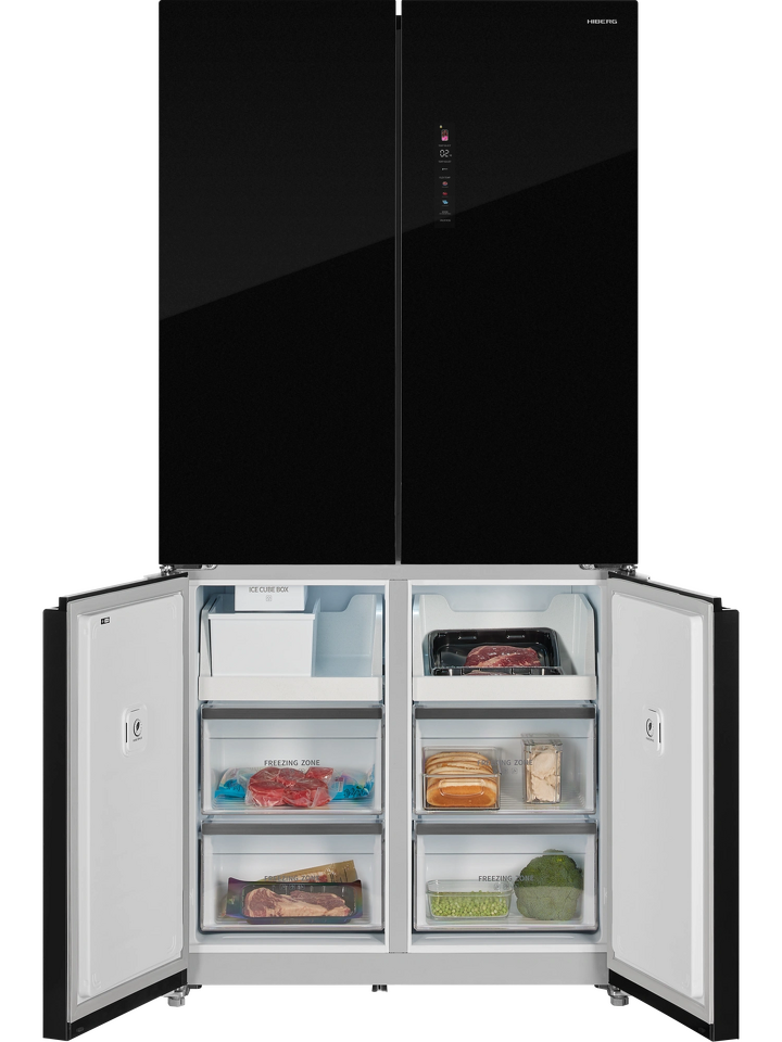 HIBERG i-RFQ 705G B — это уникальный четырехдверный холодильник с элегантным фасадом из чёрного стекла, рассчитанный на тех, кто ценит высокую вместимость, современный дизайн и функциональные решения. Высота модели составляет 191 см, а глубина — всего 60 см, что делает её идеальной для встраивания в кухонный гарнитур без зазоров и потери пространства. Такая компоновка особенно актуальна для современных интерьеров и не имеет прямых аналогов на российском рынке с точки зрения сочетания габаритов и функционала.