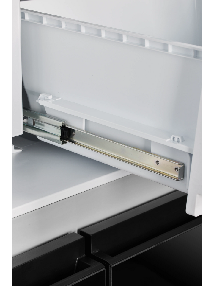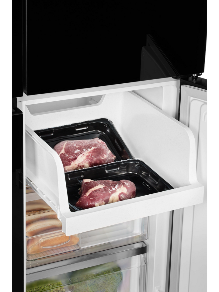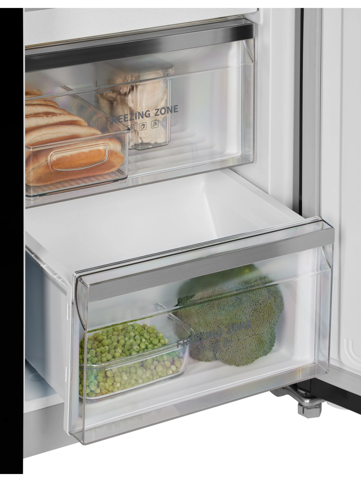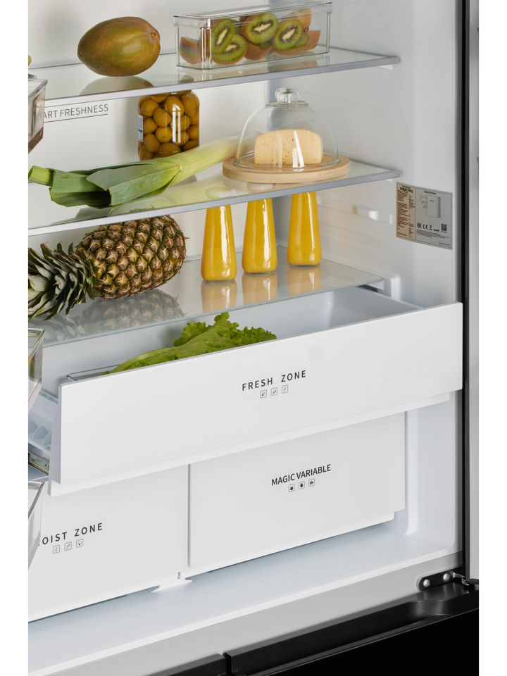 Интеллектуальное хранение и премиальная эргономика В холодильной камере расположено три вместительных выдвижных ящика на металлических направляющих. Один из них оснащён регулятором влажности и предназначен для овощей, зелени и фруктов — здесь поддерживаются оптимальные условия для сохранения свежести. Второй — это просторная мультитемпературная зона FLEX ZONE с возможностью выбора одного из трёх режимов: -4, 0 или +4 °С. Благодаря своей глубине и объему, этот ящик отлично подходит для хранения мяса, напитков или фруктов — в зависимости от потребностей.