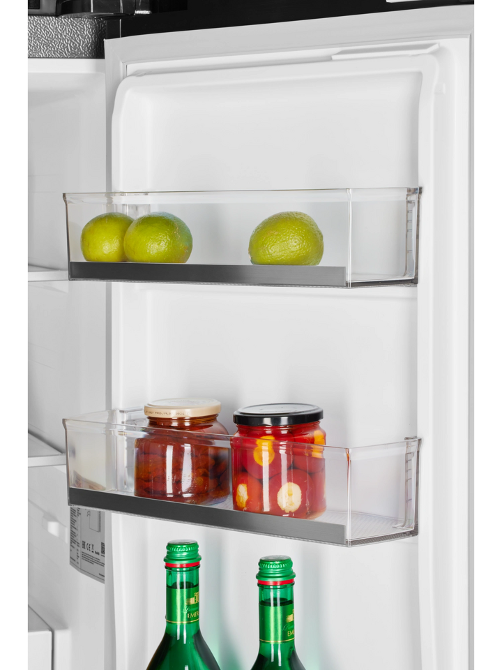 Все ящики имеют фасады из закаленного стекла, что придаёт им премиальный внешний вид и устойчивость к повреждениям. Полки выполнены из стекла, боковые карманы вместительны, а Ambient-подсветка задней стенки мягко освещает содержимое, делая использование холодильника комфортным в любое время суток.