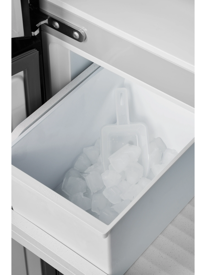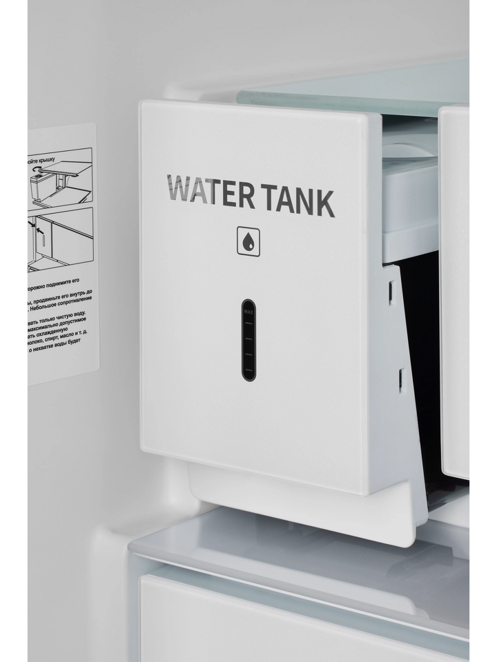 Одним из ключевых преимуществ модели является автоматический ледогенератор, который не требует подключения к водопроводу. Вода заливается вручную во встроенный резервуар объёмом 1,6 литра — и вы всегда получаете свежий лед в любое время. В морозильной камере предусмотрен контейнер для сбора льда, а в комплекте поставляется удобная лопатка.