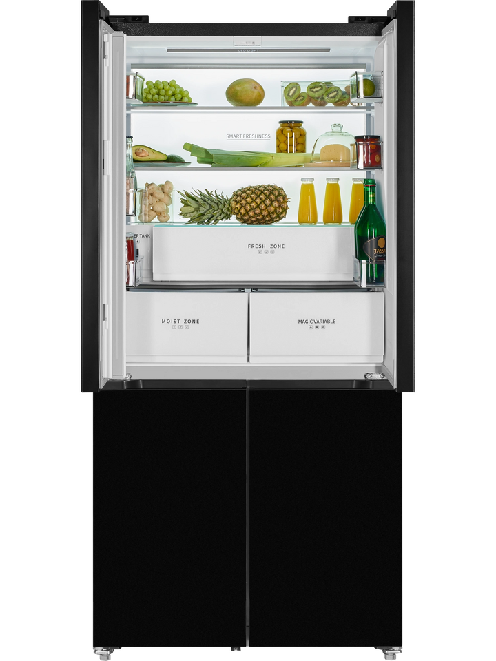 Впечатляющий общий объем 600 литров и продуманная организация внутреннего пространства позволяют легко распределять продукты, а двери с открытием на 90° обеспечивают полный доступ даже при установке рядом с мебелью. Фантомный сенсорный дисплей, встроенный в стеклянный фасад, сохраняет минимализм внешнего вида и интуитивность управления.