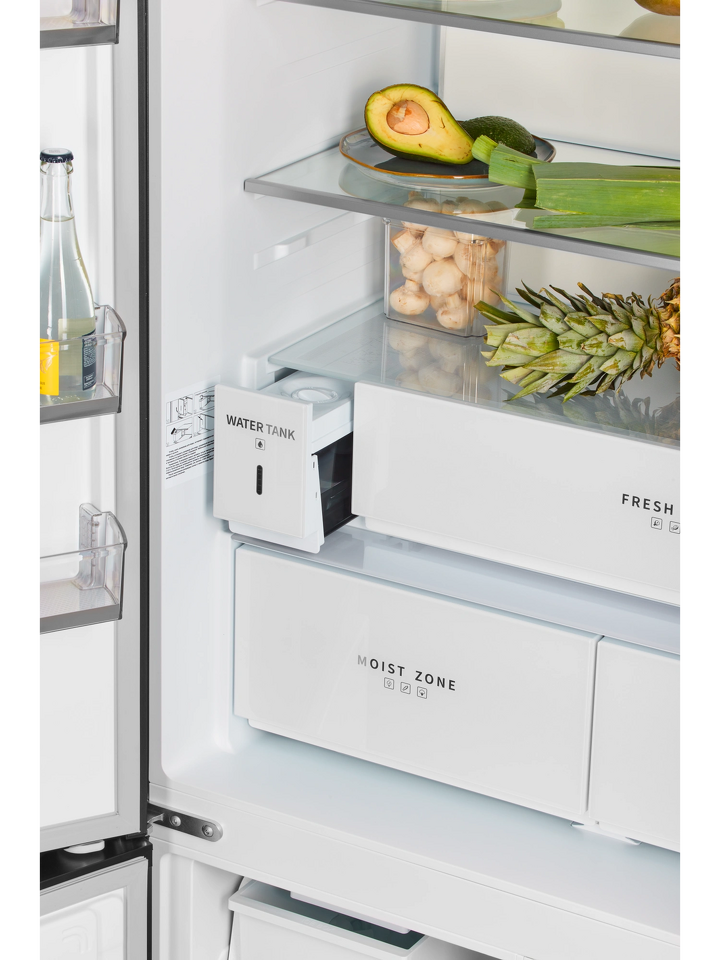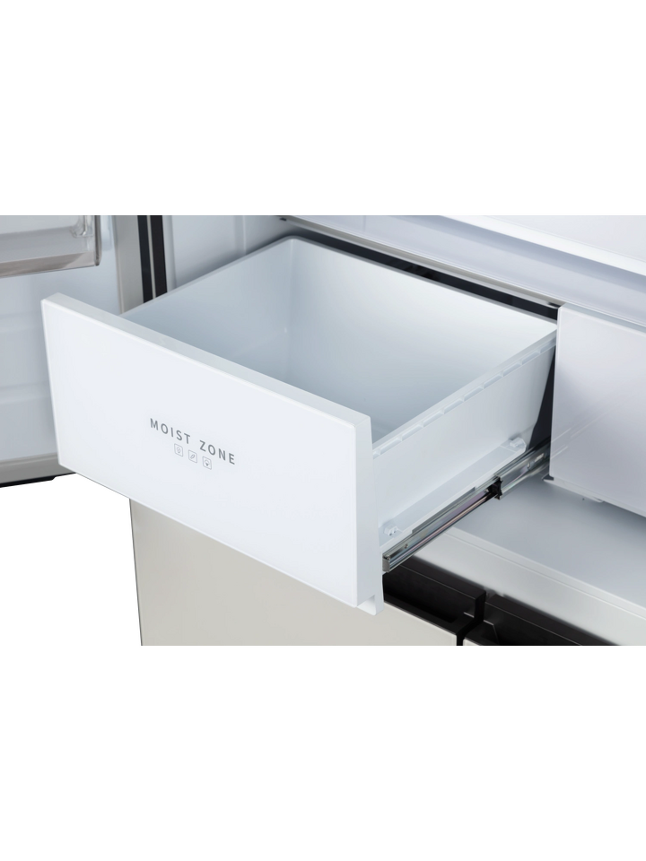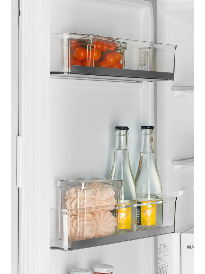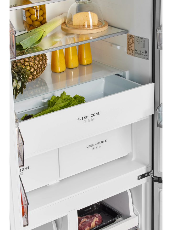 Интеллектуальное хранение и премиальная эргономика В холодильной камере расположено три вместительных выдвижных ящика на металлических направляющих. Один из них оснащён регулятором влажности и предназначен для овощей, зелени и фруктов — здесь поддерживаются оптимальные условия для сохранения свежести. Второй — это просторная мультитемпературная зона FLEX ZONE с возможностью выбора одного из трёх режимов: -4, 0 или +4 °С. Благодаря своей глубине и объему, этот ящик отлично подходит для хранения мяса, напитков или фруктов — в зависимости от потребностей.