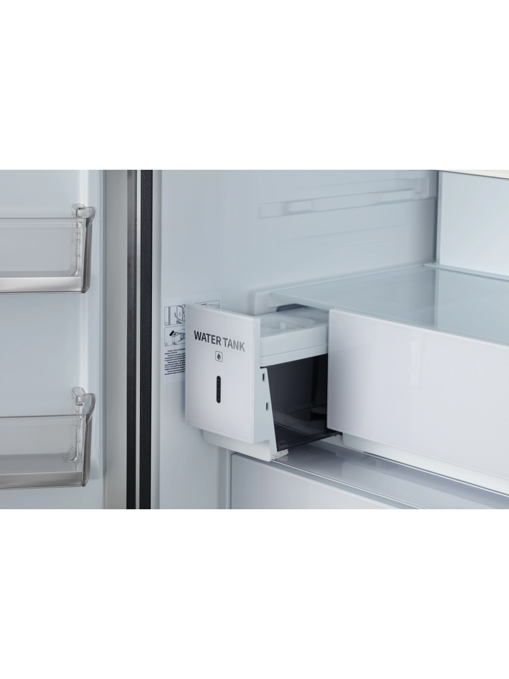 Одним из ключевых преимуществ модели является автоматический ледогенератор, который не требует подключения к водопроводу. Вода заливается вручную во встроенный резервуар объёмом 1,6 литра — и вы всегда получаете свежий лед в любое время. В морозильной камере предусмотрен контейнер для сбора льда, а в комплекте поставляется удобная лопатка.