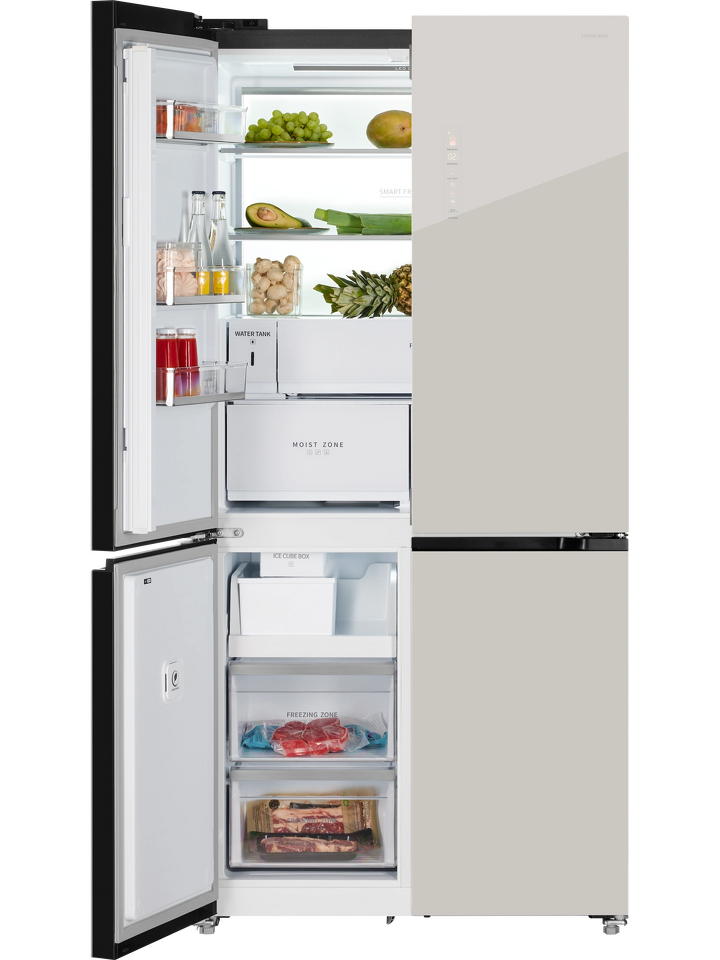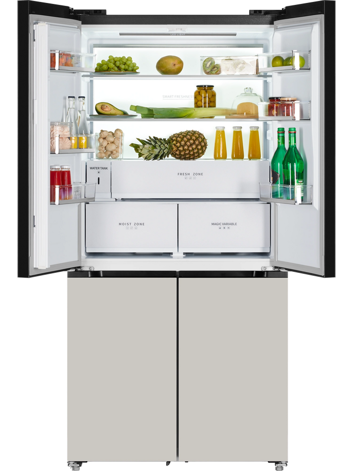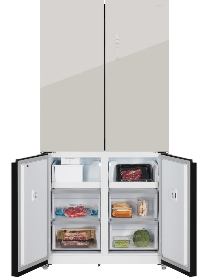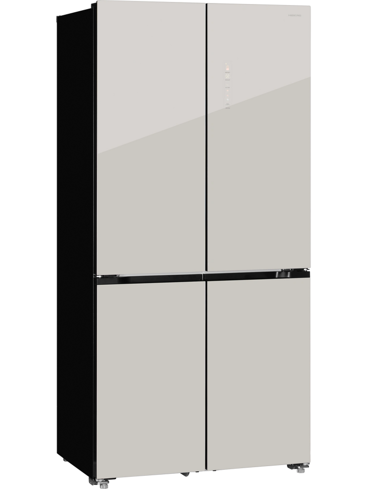 HIBERG i-RFQ 705G Y — это уникальный четырехдверный холодильник с элегантным фасадом из бежевого стекла, рассчитанный на тех, кто ценит высокую вместимость, современный дизайн и функциональные решения. Высота модели составляет 191 см, а глубина — всего 60 см, что делает её идеальной для встраивания в кухонный гарнитур без зазоров и потери пространства. Такая компоновка особенно актуальна для современных интерьеров и не имеет прямых аналогов на российском рынке с точки зрения сочетания габаритов и функционала.