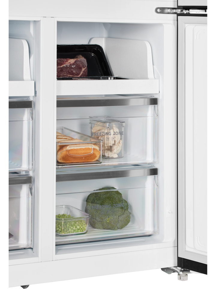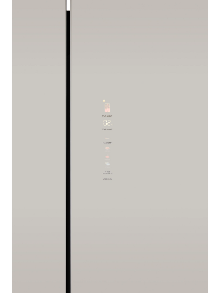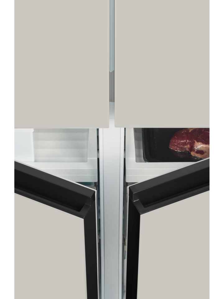Впечатляющий общий объем 600 литров и продуманная организация внутреннего пространства позволяют легко распределять продукты, а двери с открытием на 90° обеспечивают полный доступ даже при установке рядом с мебелью. Фантомный сенсорный дисплей, встроенный в стеклянный фасад, сохраняет минимализм внешнего вида и интуитивность управления.