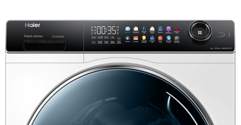 Представляем стиральную машину HW80-B14279 новой серии Color&Touch в белом цвете. Максимальная загрузка данной машины — 8 кг, а отжим — 1400 оборотов.