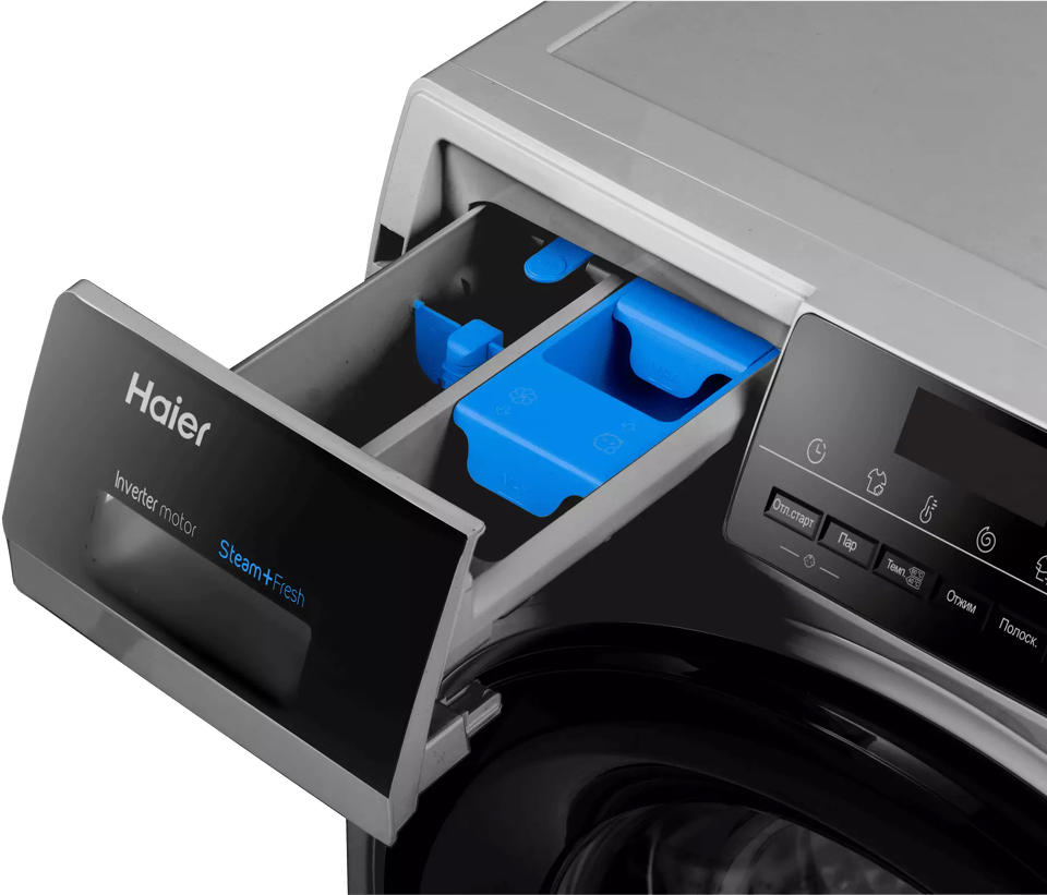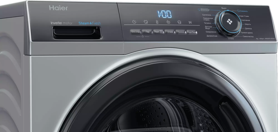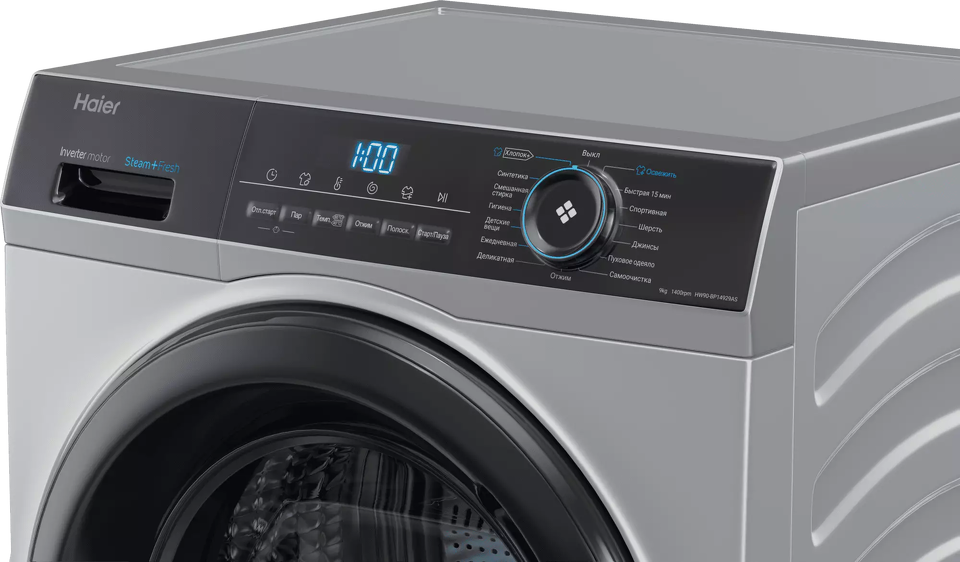 Haier HW90-BP14929AS — стиральная машина серебристого цвета с черной дверцей и панелью управления. Модель вместительная — барабан с гладкими подушечками Pillow и автовзвешиванием вмещает до 9 кг вещей. Максимальная скорость вращения барабана — 1400 об/мин, при этом энергоэффективность модели соответствует классу A+++. Достигается это за счет инверторного мотора с гарантией 12 лет.