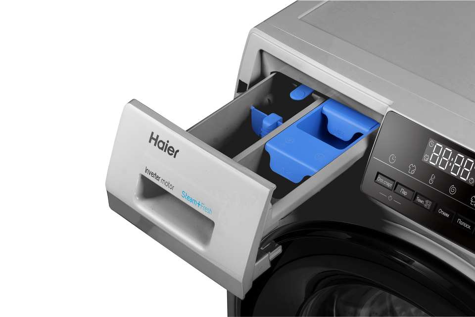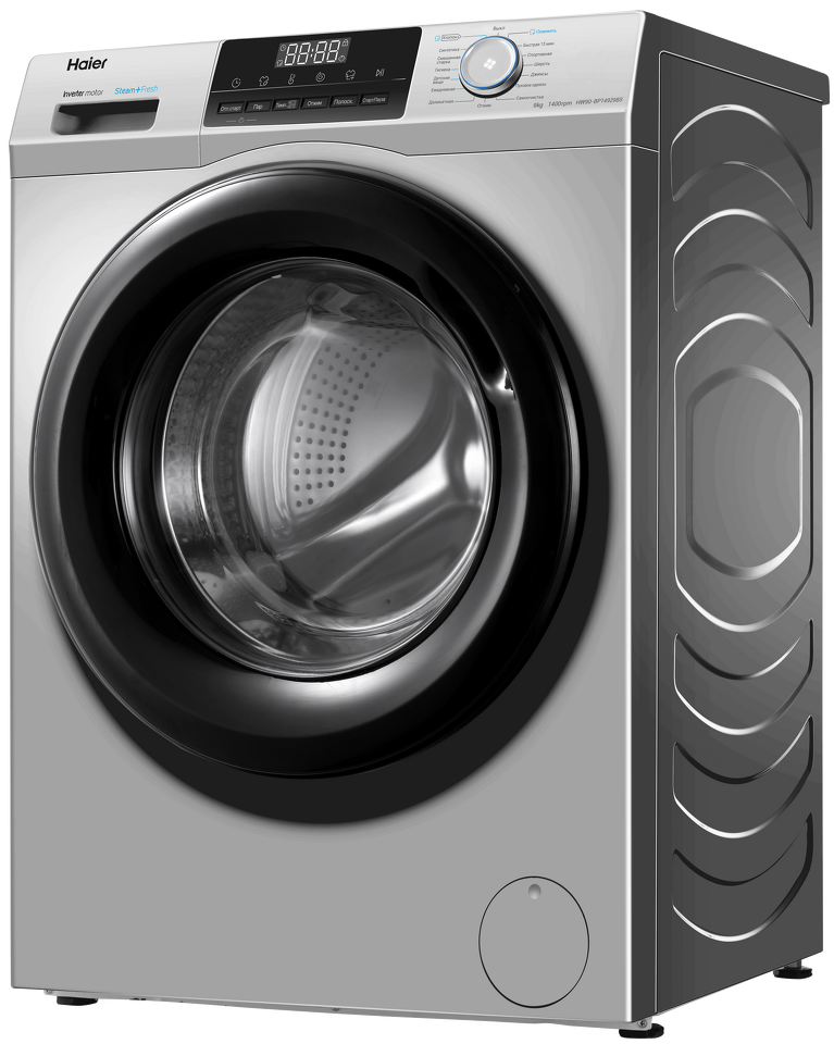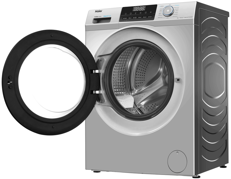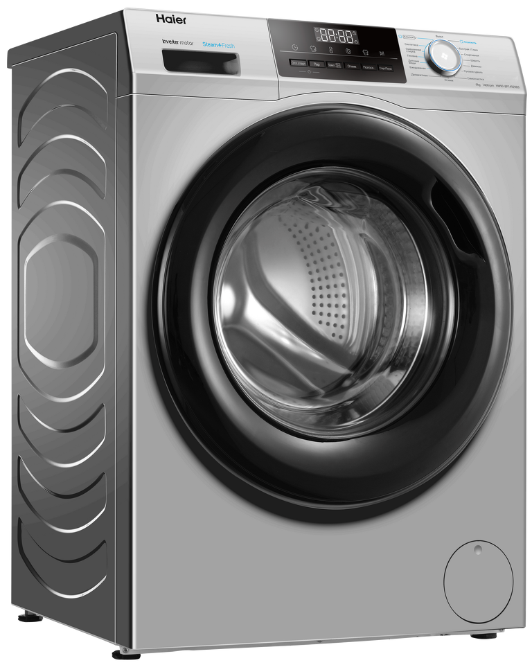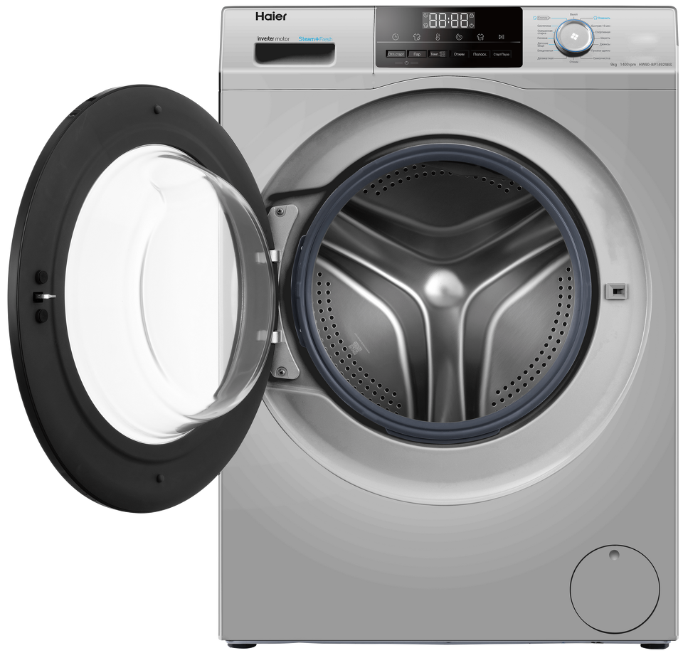 Haier HW90-BP14929B — полноразмерная стиральная машина с фронтальной загрузкой. Корпус — серебристый, с дверцей и LED-дисплеем черного цвета, что делает модель стильным акцентом в любом интерьере. Благодаря загрузке до 9 кг она подходит для большой семьи, а инверторный мотор со скоростью отжима до 1400 об/мин обеспечивает высочайший класс стирки и существенно экономит электричество.
