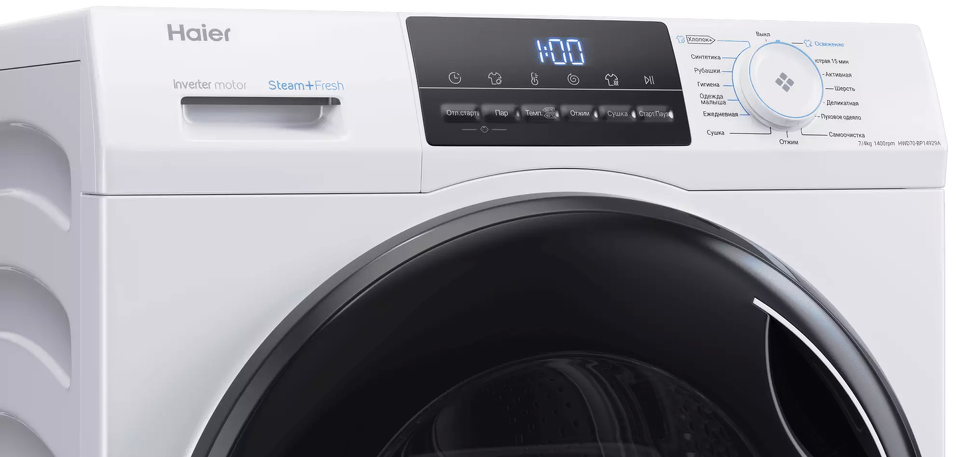 Haier HWD70-BP14929A — узкая стирально-сушильная машина глубиной 45 см, обладающая большой загрузкой для своих габаритов: 7 кг в режиме стирки и 4 кг в режиме сушки. Модель представлена в белом корпусе, с черным LED-дисплеем и затененной дверцей.