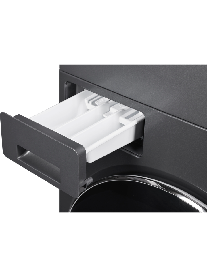 Монокомплект стиральной и сушильной машин темно-серого цвета с черными дверцами люков выполнен в современном дизайне. В верхней части устройства расположена интуитивно понятная сенсорная панель управления на цветном LED-дисплее. Индикация подскажет тип стирки, температуру, показатели сушки и полоскания, скорость, время, отложенный старт, защиту от детей, код ошибки, старт или паузу и дополнительные опции.