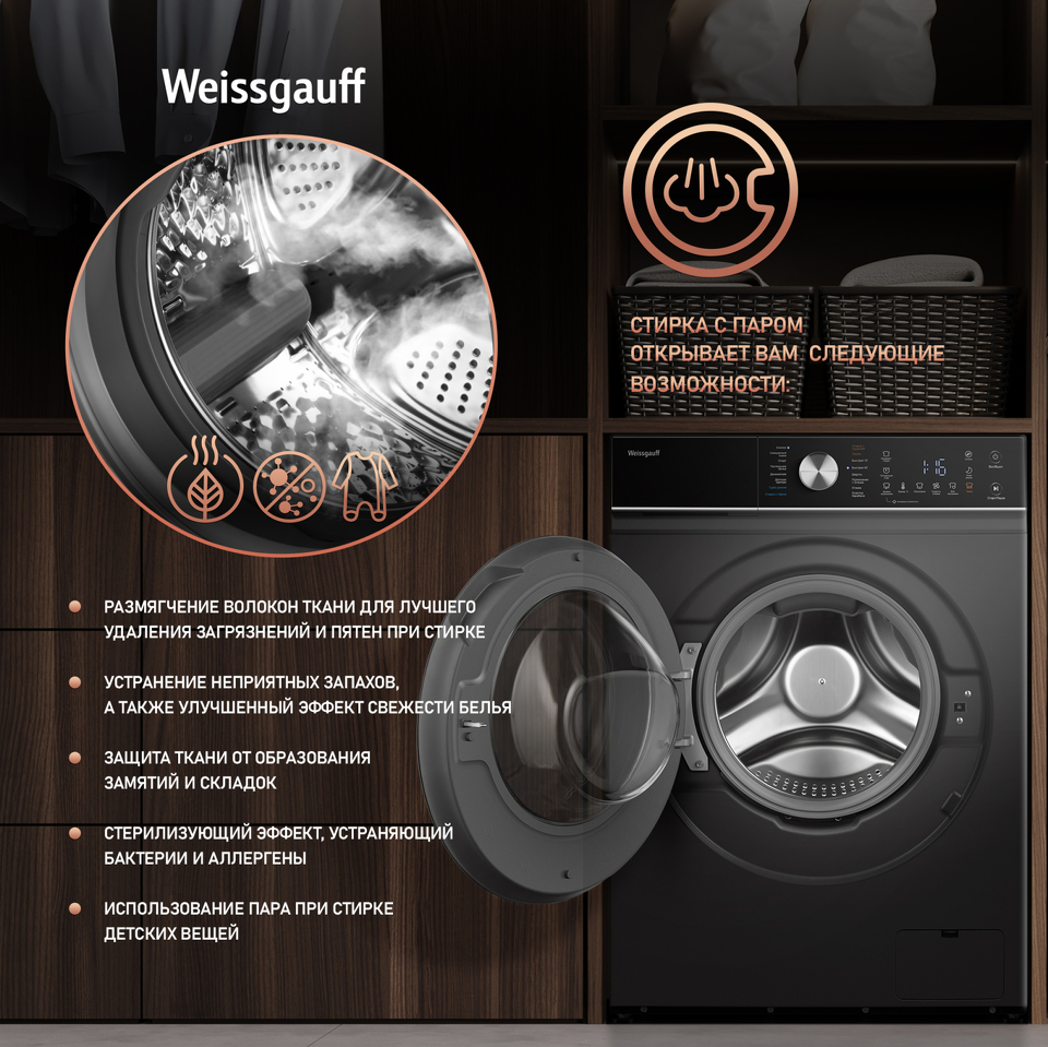 Функция "Пар" - это инновационное решение от компании Weissgauff, которое позволит придать свежести вещам, а также устранить неприятный запах, легкие загрязнения и складки на одежде, бережно сохраняя при этом структуру волокон ткани. При выборе данной функции, пар добавляется в ходе цикла в процессе работы программы.