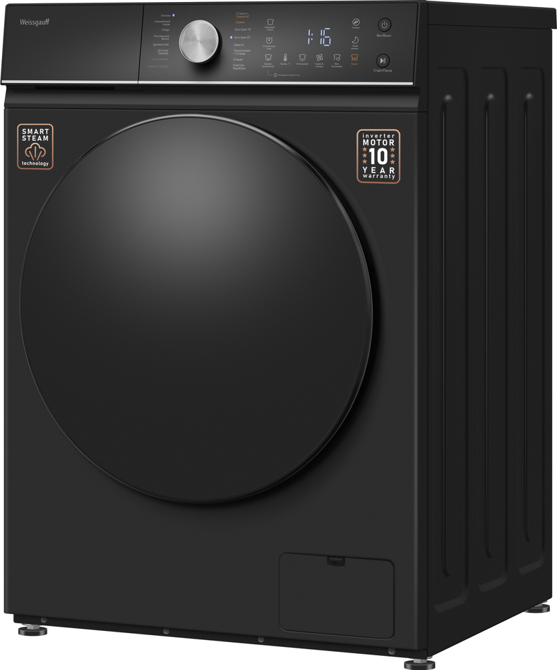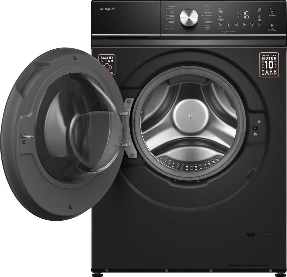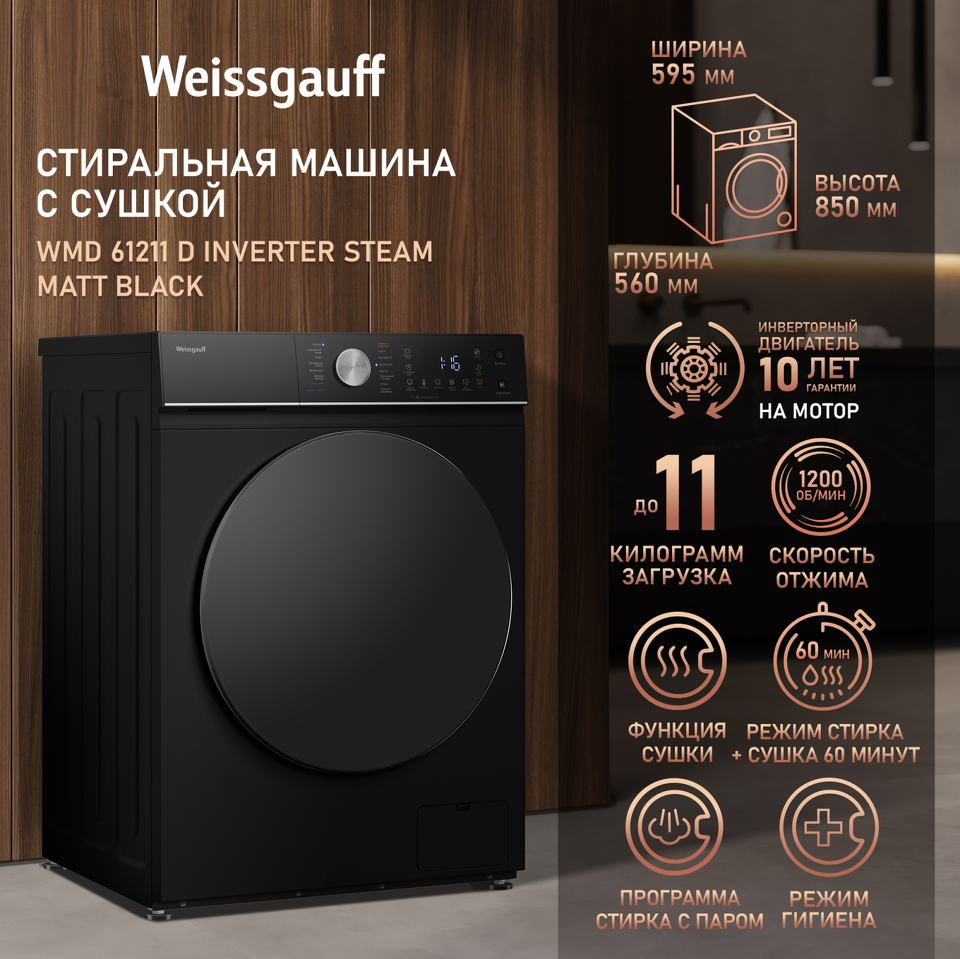 Отдельностоящая стиральная машина с сушкой, обработкой паром, оснащенная инверторным двигателем, имеет впечатляющий показатель загрузки до 11 кг белья при стирке и 7 кг при сушке, а также впечатляющую скорость отжима до 1200 оборотов в минуту - что делает эту модель одной из наиболее передовых в линейке стиральных машин Weissgauff.