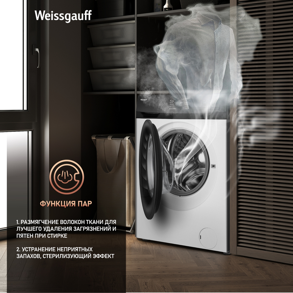Функция "Пар" - это инновационное решение от компании Weissgauff, которое позволит придать свежести вещам, а также устранить неприятный запах, легкие загрязнения и складки на одежде, бережно сохраняя при этом структуру волокон ткани. При выборе данной функции, пар добавляется ближе к середине цикла программы стирки белья, на этапах стирки и полоскания.