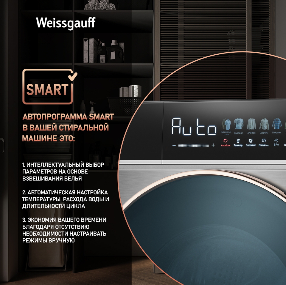 Функция "Пар" (SPA) - это инновационное решение от компании Weissgauff, которое позволит придать свежести вещам, а также устранить неприятный запах, легкие загрязнения и складки на одежде, бережно сохраняя при этом структуру волокон ткани. При выборе режимов, имеющих в своем цикле данную функцию, пар добавляется в ходе цикла в процессе работы программы!