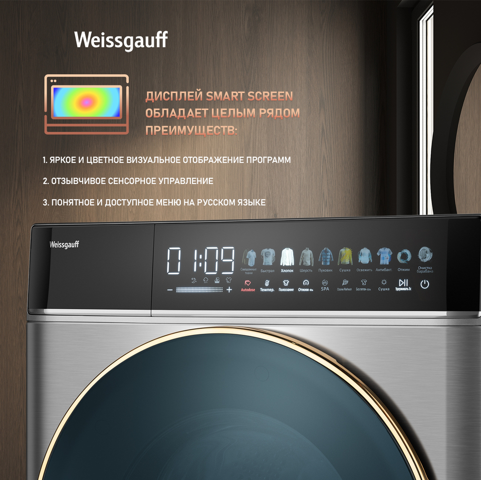 Цветной дисплей SMART SCREEN с сенсорным управлением отражает всю современность и технологичность подходов Weissgauff к созданию своих устройств, делая процесс взаимодействия с данной моделью ещё более простым и удобным!