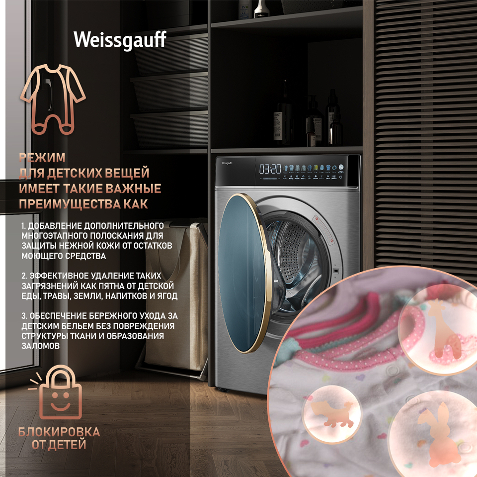 Функция "Пар" (SPA) - это инновационное решение от компании Weissgauff, которое позволит придать свежести вещам, а также устранить неприятный запах, легкие загрязнения и складки на одежде, бережно сохраняя при этом структуру волокон ткани. При выборе режимов, имеющих в своем цикле данную функцию, пар добавляется в ходе цикла в процессе работы программы!