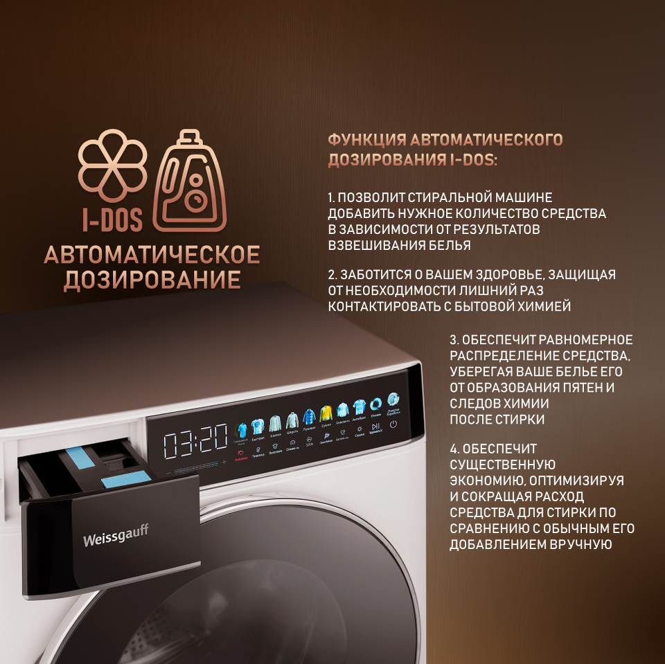 Автоматическое дозирование I-DOS - позволит стиральной машине самостоятельно добавить нужное количество средства для стирки в зависимости от веса белья. Вам не потребуется лишний раз контактировать с бытовой химией - система I-DOS сохранит ваше здоровье. Качество стирки каждый раз будет высочайшим, а на белье никогда не будет пятен от излишка порошка - ведь система I-DOS самостоятельно подберет нужное количество моющего средства, не больше и не меньше! Это также позволит вам ощутить существенную выгоду, ведь расход моющего средства теперь будет оптимизирован!