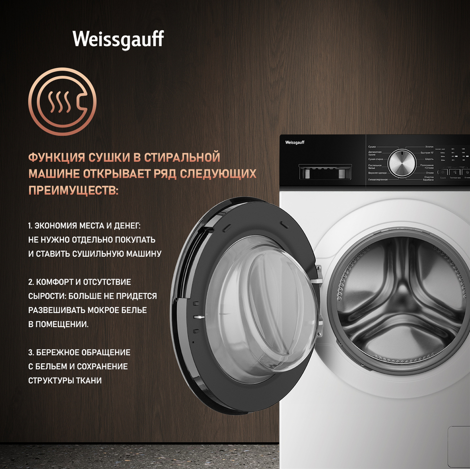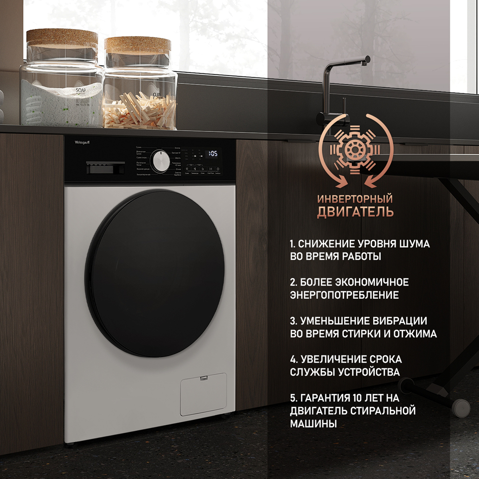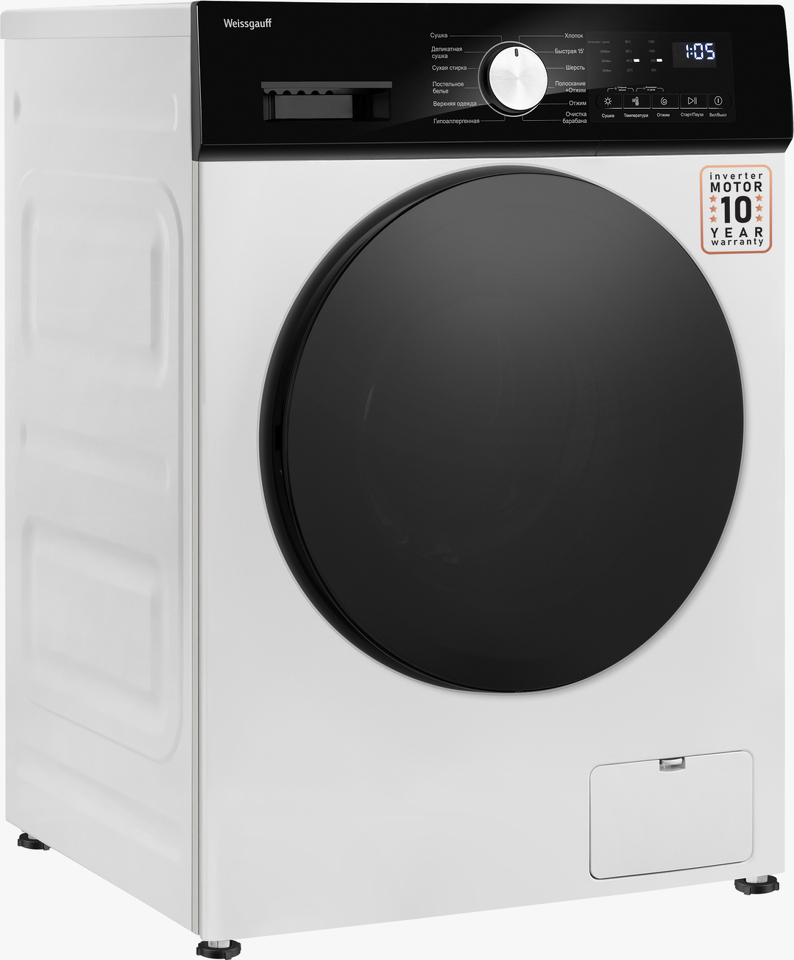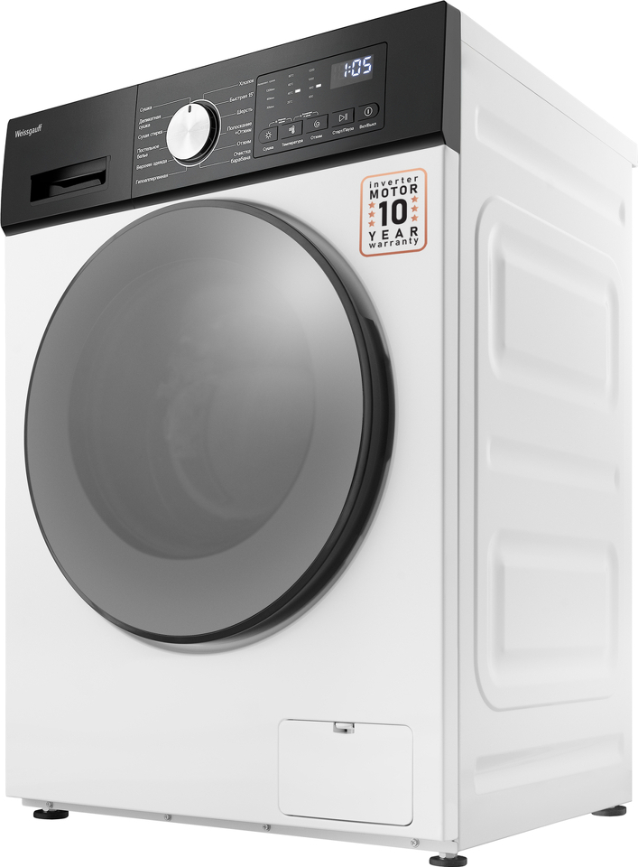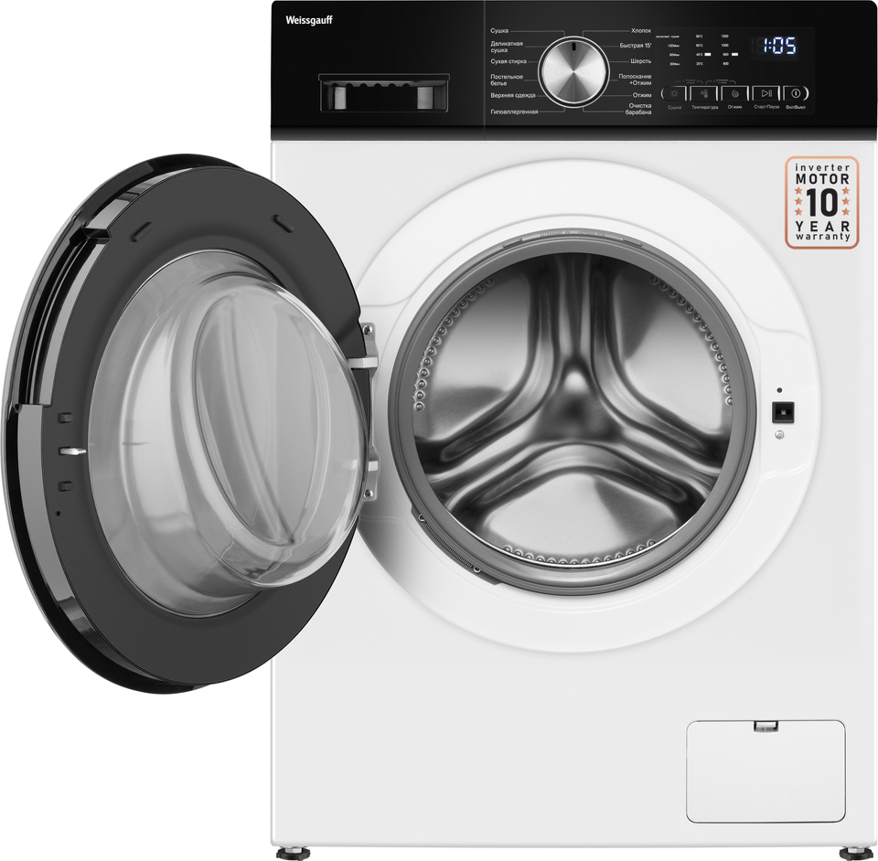 Отдельностоящая стиральная машина с функцией сушки Weissgauf, оснащенная инверторным двигателем, работающим по особой технологии BLDC, имеет фантастический показатель загрузки до 10,5 килограммов белья и невероятную скорость отжима до 1200 оборотов в минуту - это гарантия непревзойденной эффективности и высокого результата при каждой стирке вашего белья.